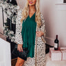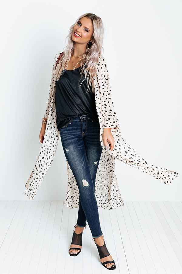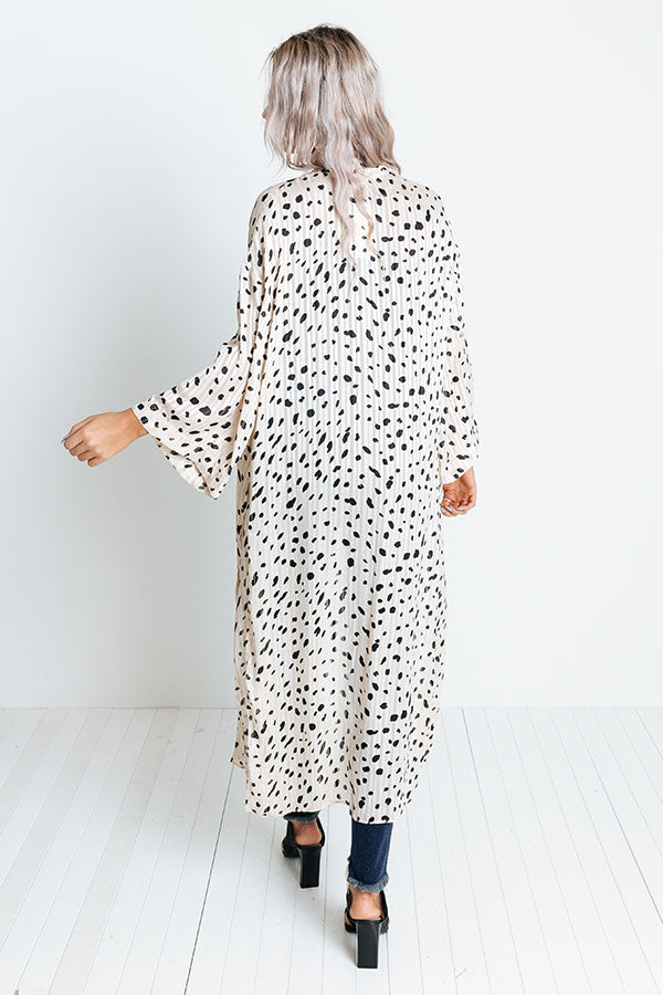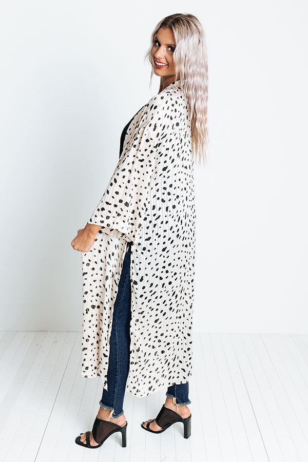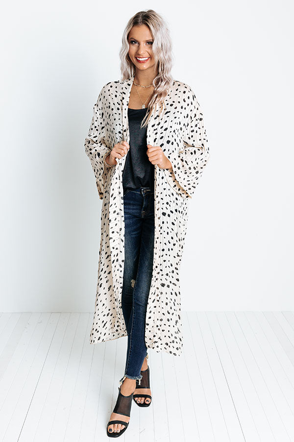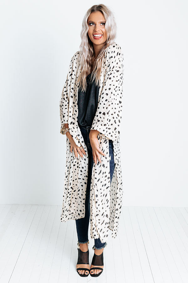 Add a thoughtful finish to your look with this pretty ivory hued duster featuring ultra lightweight and breezy material patterned with a black spotted print, long loose sleeves, and an ultra draped open front silhouette that cascades into a straight mid-calf length hemline with accent side slits!