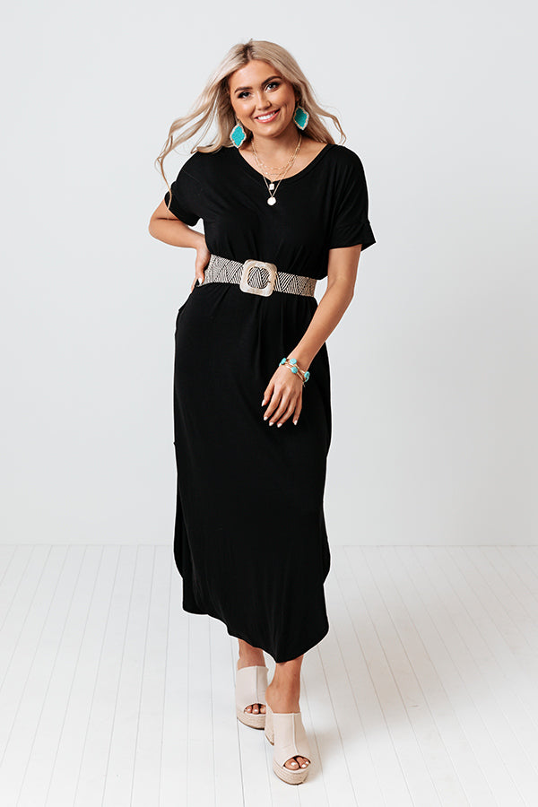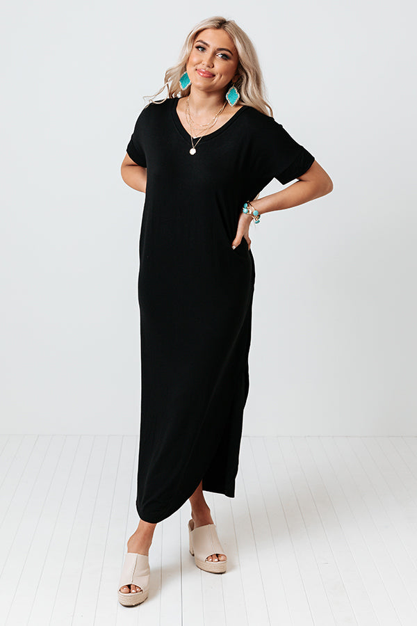 You style is sure to thrive in this timeless black maxi dress featuring soft lightweight and flowy material, a hounded neckline, short loose sleeves, hidden side pockets, and relaxed silhouette that falls into a rounded ankle-length hemline with accent side slits! Measurements