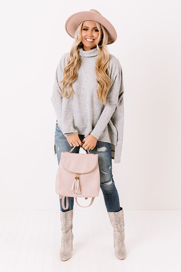 This trendy grey tunic is your ticket to cozy with its soft lightweight material, waffle knit texturing, turtle neckline, long fitted sleeves, and ultra relaxed silhouette that cascades into a straight high/low upper-thigh length hemline with accent side slits!