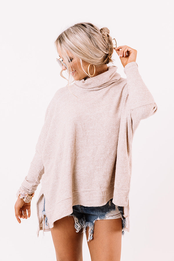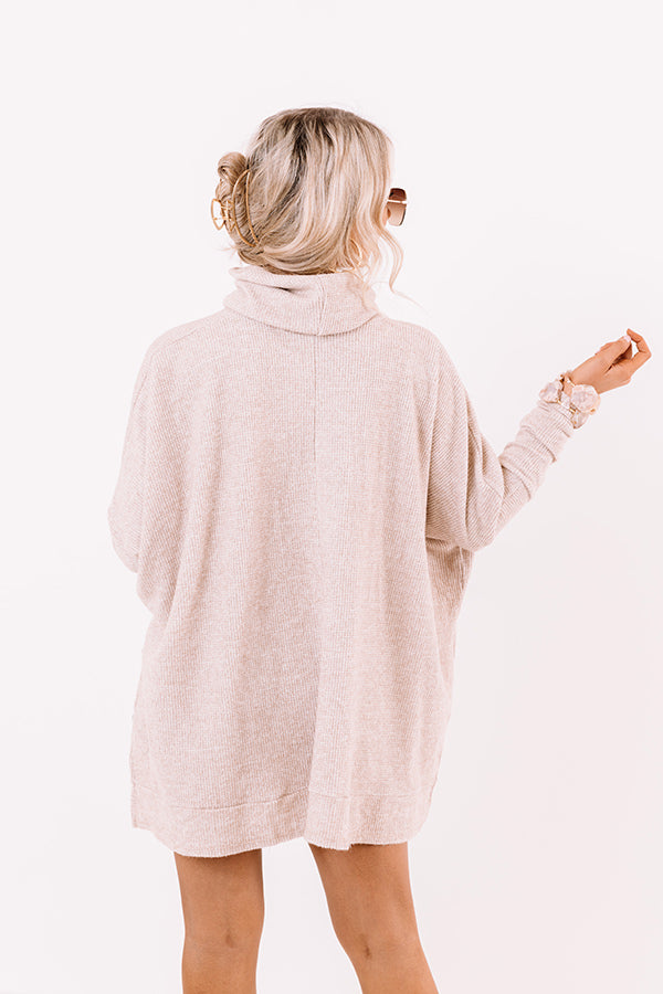 This trendy iced latte colored tunic is your ticket to cozy with its soft lightweight material, waffle knit texturing, turtle neckline, long fitted sleeves, and ultra relaxed silhouette that cascades into a straight high/low upper-thigh length hemline with accent side slits!