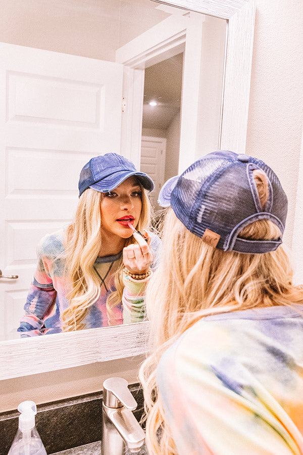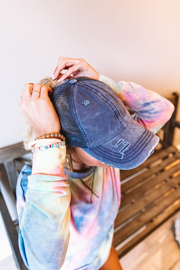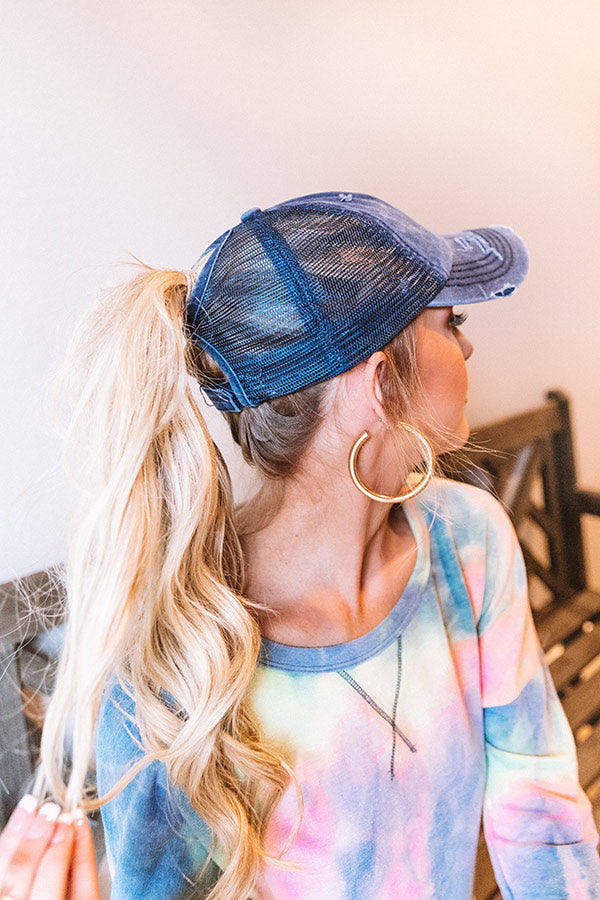 This trendy navy baseball cap is your "ticket to style" with its lightweight mesh material, denim like front panel, subtle distressed detailing, and curved brim!