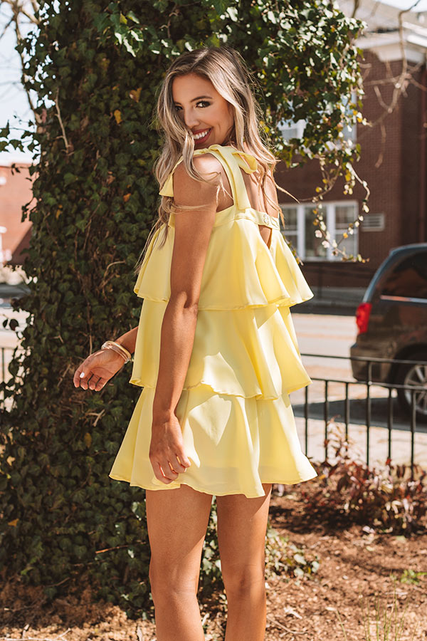 This vibrant yellow shift dress will have you saying "tier comes the sun" with its lightweight breezy material, a straight neckline with 1-inch tied shoulder straps, a v-cutout back with a button closure, and an ultra relaxed three tiered silhouette that falls into an uneven mid-thigh length hemline! You can style this sweetie with a gold wedge and statement earring, or it can be worn with "The Jess Faux Leather Wedge in Natural" and our "Parisian Travels Crossbody in White" for a variety of gorgeous Easter looks that you will want to wear time and time again!