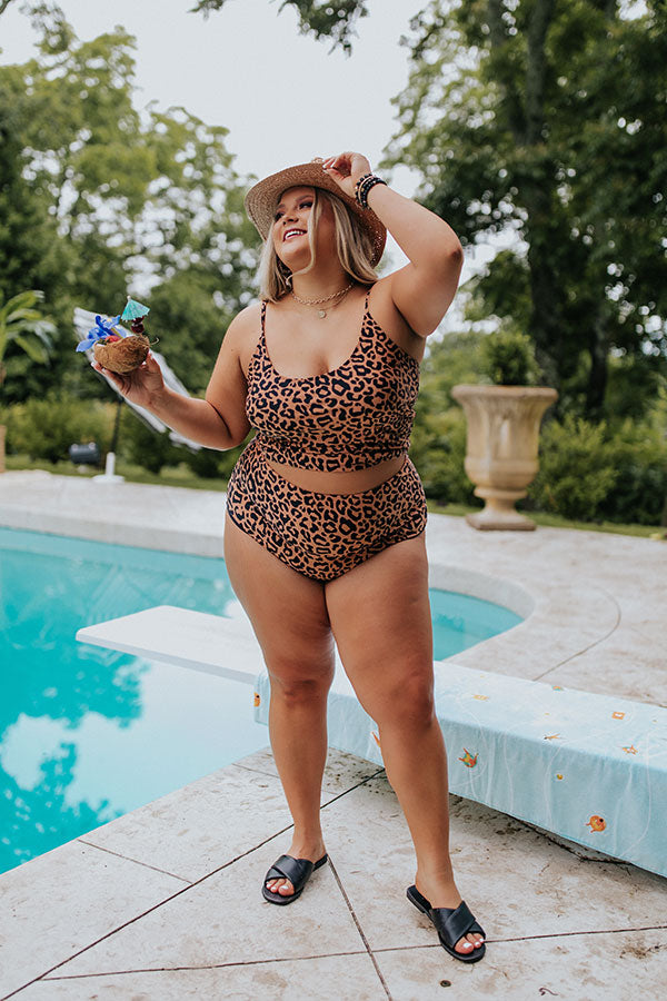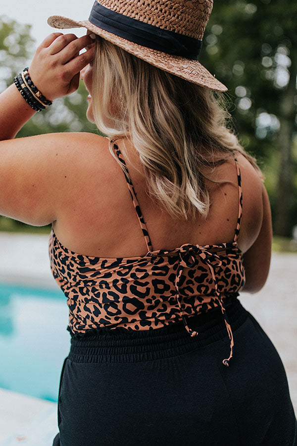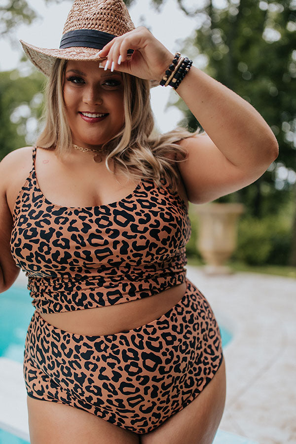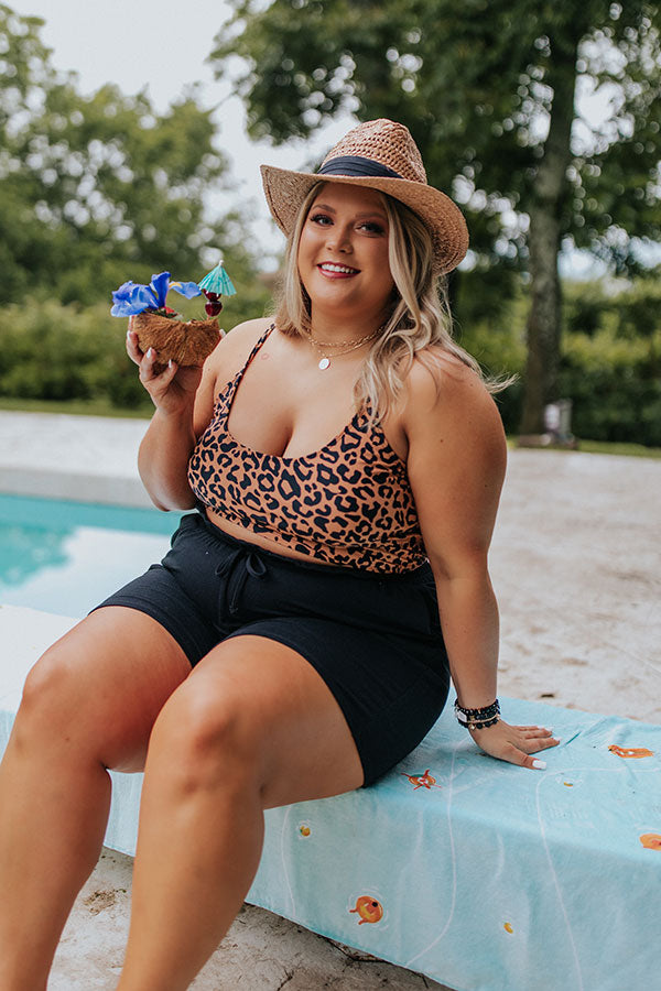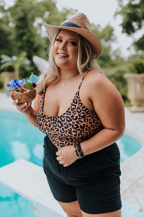 Plus Size - Take a walk on the wild side in our adorable brown 'Tikis Please' tankini featuring lightweight four-way stretch material patterned with a black leopard print, a scooped neckline with spaghetti straps that tie across the back, and a flattering figure hugging silhouette that ends in a straight hemline! PLUS, this cutie comes with removable padding!