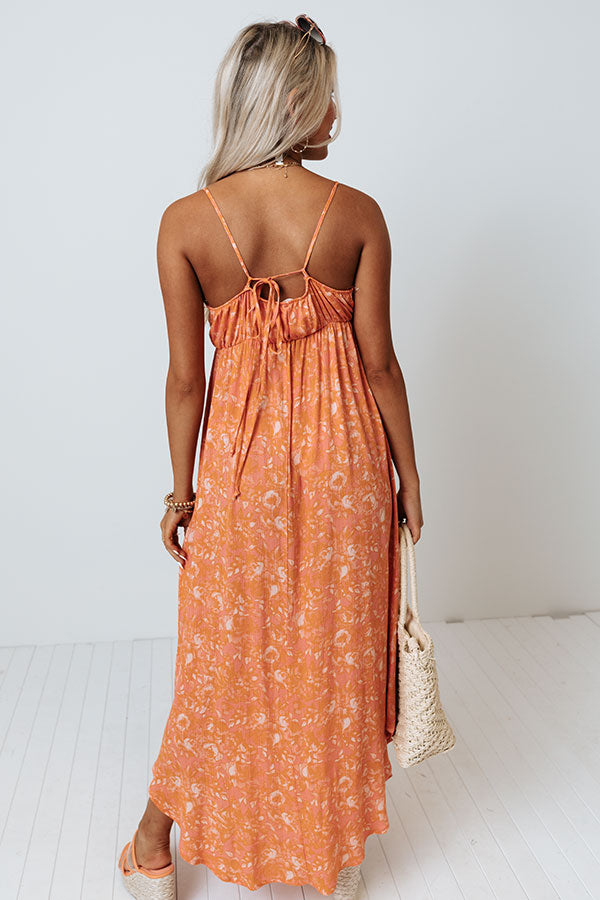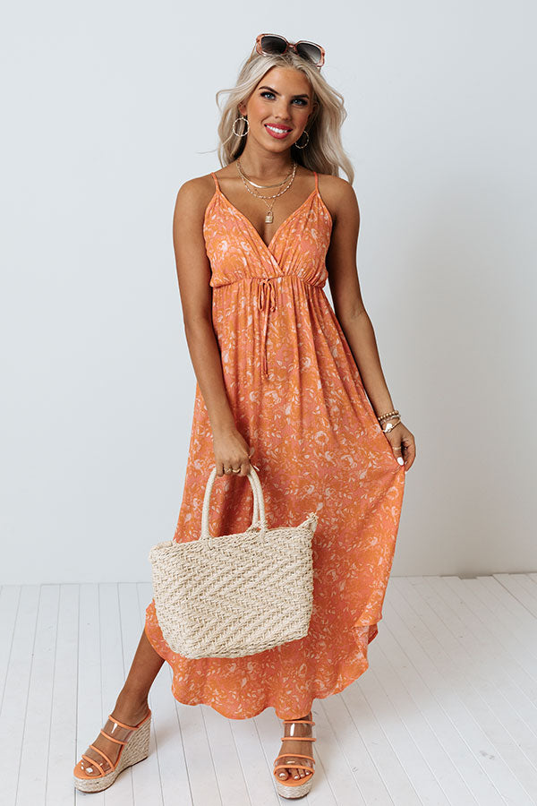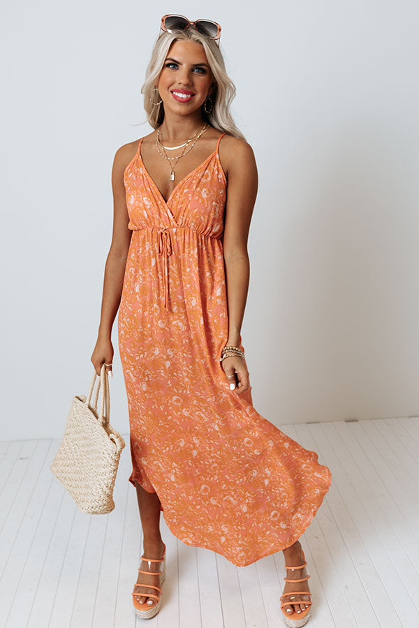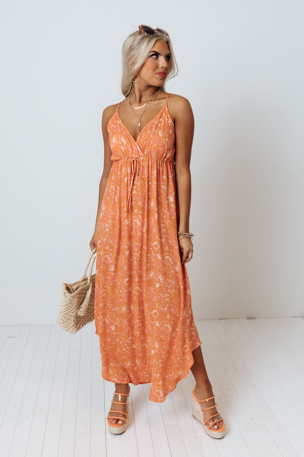 Make the world your runway in our beautiful orange 'Tikis Please Midi' dress featuring lightweight material patterned with a subtle natural hued floral print, a faux wrap bodice with a v-cut neckline, an accent tie front detail, spaghetti straps that tie across the open back, and a flattering skirt silhouette that falls into a straight mid-calf length hemline! Measurements