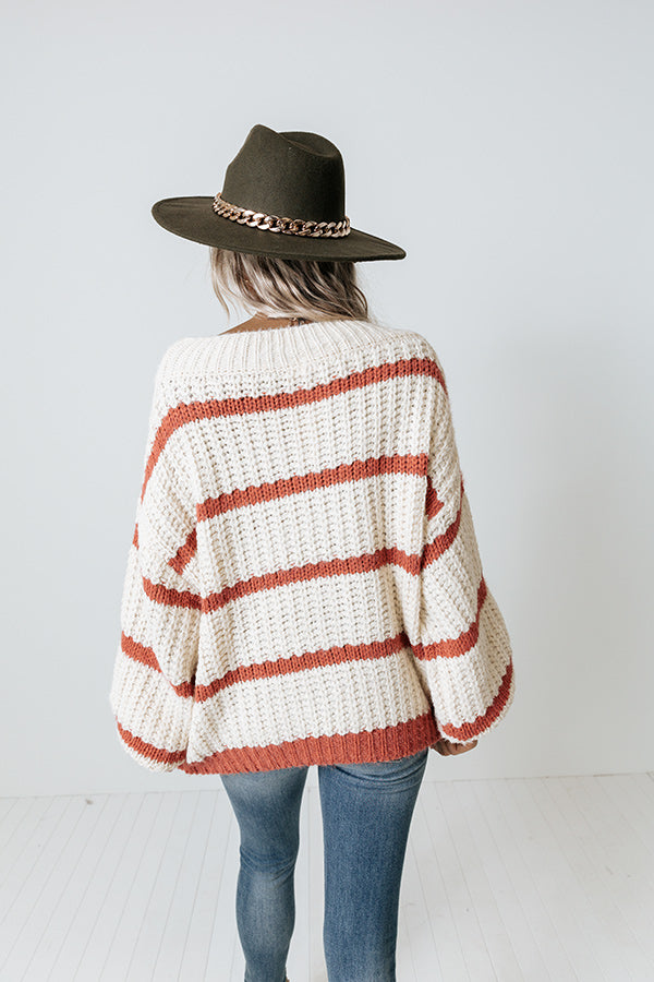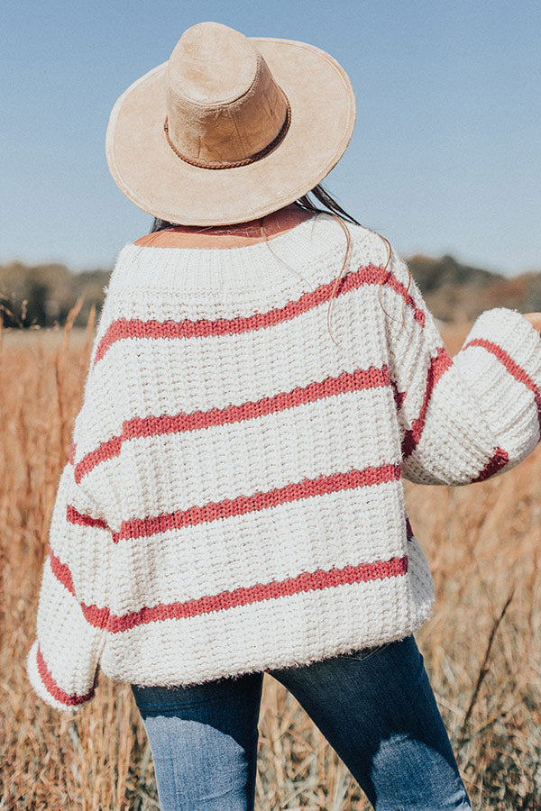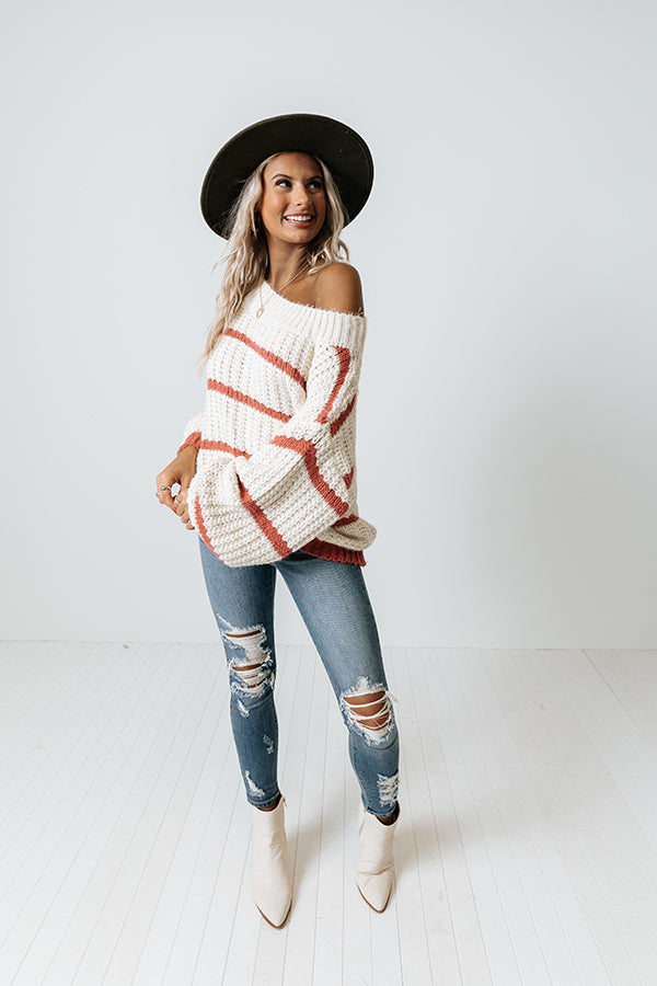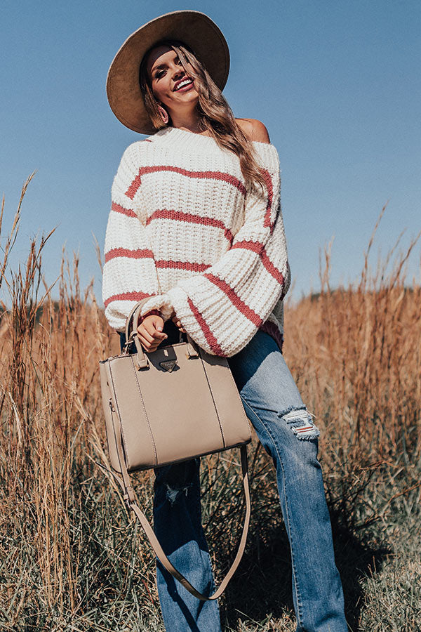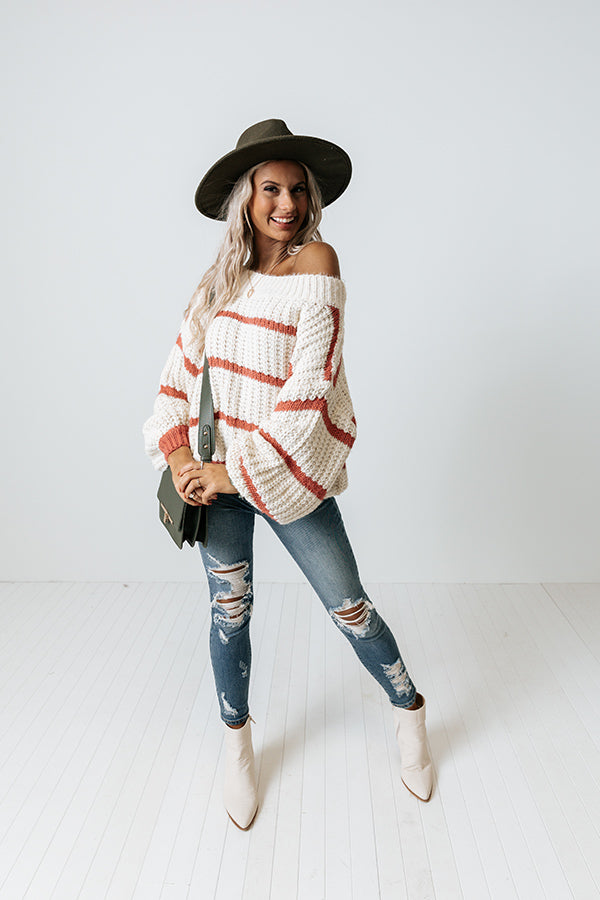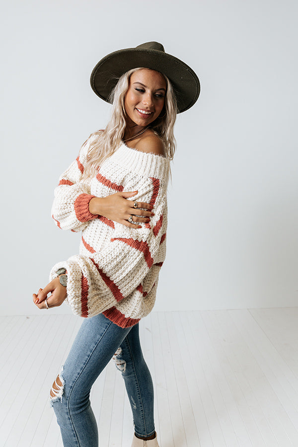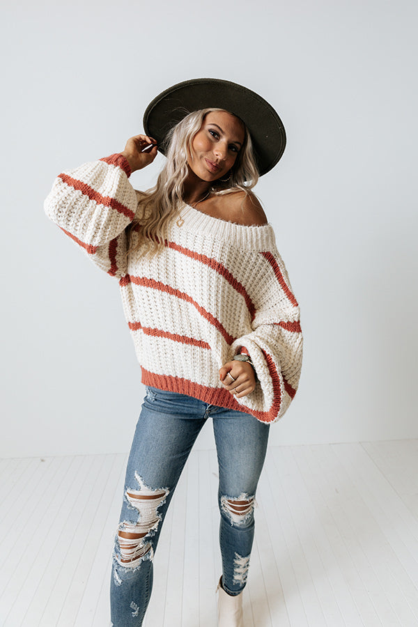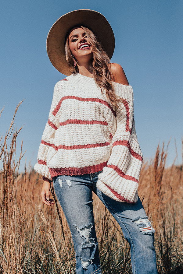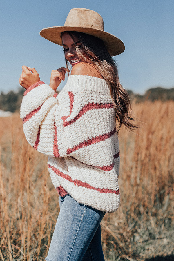 It's almost time for flurries, which means it's also almost time to bust out your fave chunky sweaters! This white cutie is a cold weather wardrobe must have with its thick tight knit material with ribbed texturing, horizontal rose colored accent stripes, high rounded neckline that can be worn off one shoulder, long oversized bishop sleeves with fitted cuffs, and ultra relaxed silhouette that falls into a straight hemline!
