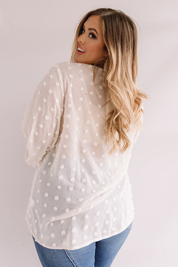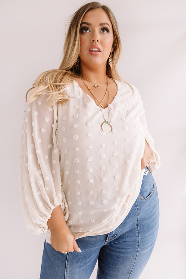 Plus Size - Life isn't perfect, but you OOTD can be with our charming cream colored "Time For Mai Tais Shift Top" featuring lightweight semi-sheer layered material patterned with polka dot texturing, a v-cut neckline, long oversized bishop sleeves with fitted elastic banded cuffs, and a relaxed silhouette that falls into a straight hemline! We have styled this cutie with some denim flares and a brown platform heel and clutch, but you can also wear it with some distressed skinnies, "The Underwood Faux Leather Wedge in Blush," and our "Pass The Prosecco Wool Hat in Blush!" Measurements