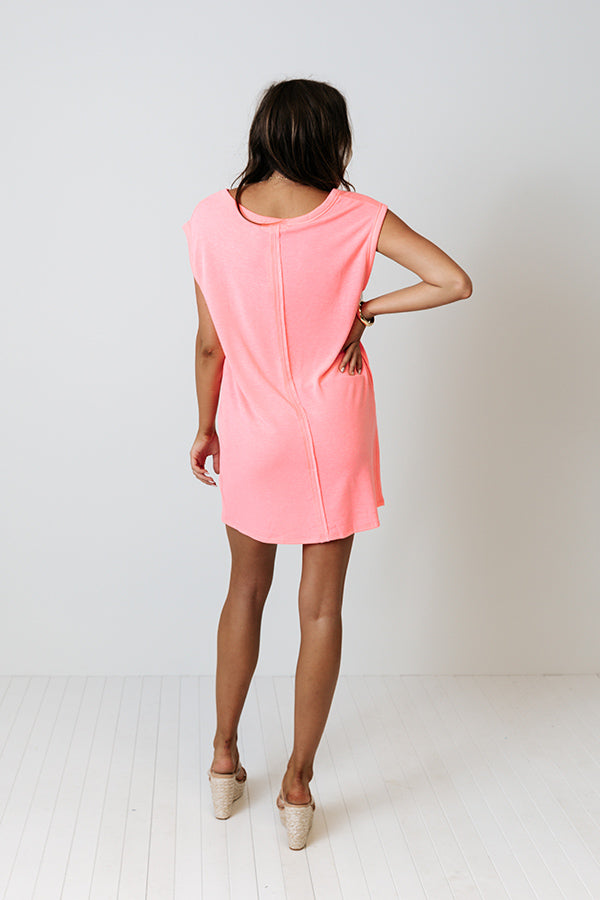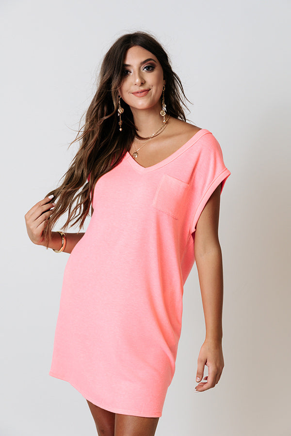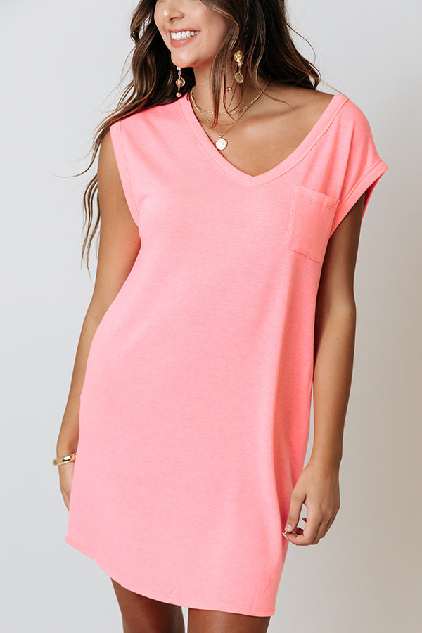 Spend your time in the sun in style with this casual neon pink shift dress featuring lightweight flowy material, a v-cut neckline, flirty cap sleeves, a single accent chest pocket and hidden side pockets, and a slouched silhouette that falls into a straight mid-thigh length hemline! Measurements