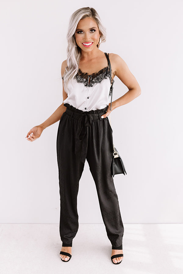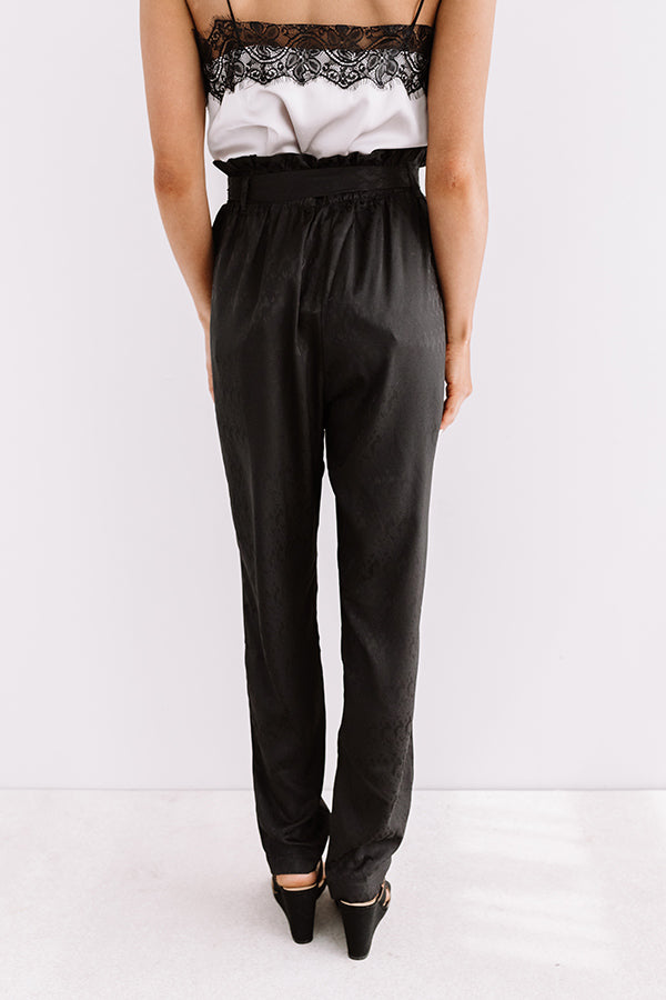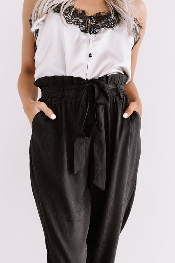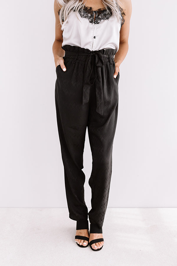 There are no better bottoms to wear when it is "time to impress" than these stunning black pants featuring lightweight material patterned with a subtle metallic print, a smocked high waistline with ruffled trim detailing and a tie belt closure, accent side pockets, and a relaxed trouser silhouette that falls into straight ankle length hemlines! We have styled these cuties with a chic white top, neutral heels, and a matching tote, but you can also wear it with a basic blush tank under our "Adventure Abroad Blazer in White" with "The Melina Heel in White!" Measurements