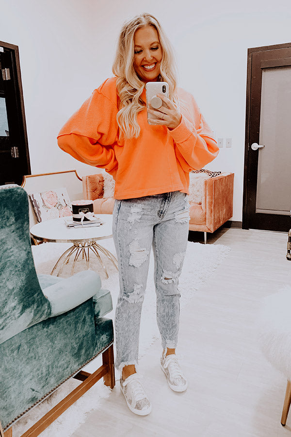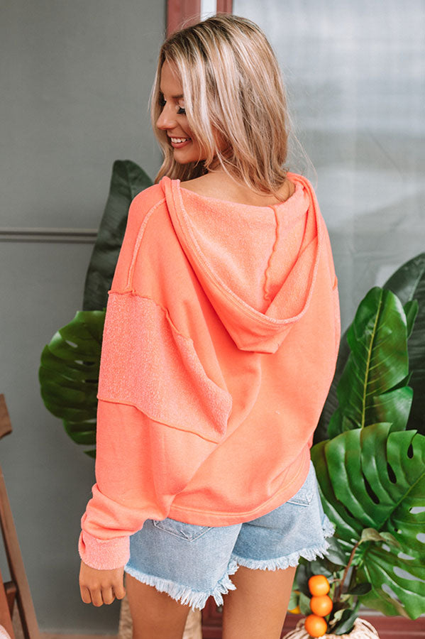 You won't find a cozier piece to wear when it is "time to lounge" than this cute coral colored hoodie featuring soft lightweight material, a v-cut neckline with a hooded back, exposed raw cut accent seams, long bubble sleeves with wide fitted cuffs, and a relaxed silhouette that falls into a straight hemline! We have dressed this bright transitional piece down with some denim shorts and trendy cheetah print sneakers, but you can also style it up with some frayed black skinnies, "The Lela Espadrille in Coral," and our "Exciting Sights Metallic Pinstripe Backpack in Silver!" Measurements