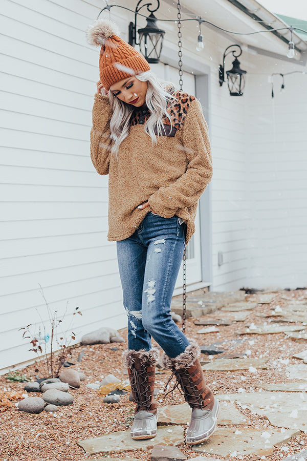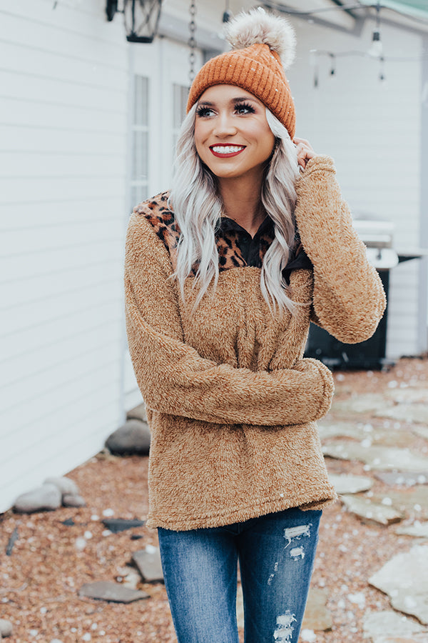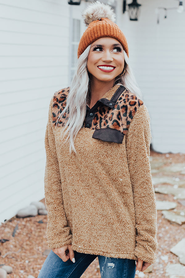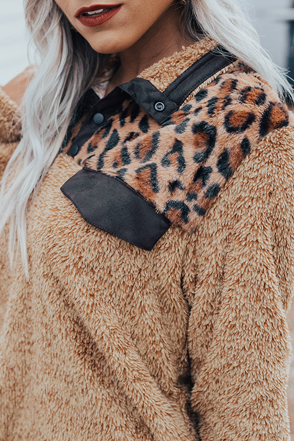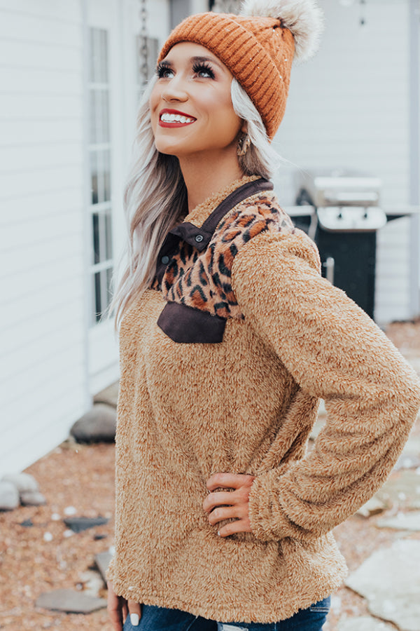 We think it's "time to treat yourself" to this adorable and ultra warm pullover featuring neutral hued soft lightweight faux fur material with bold black and brown leopard print shoulders, long loose sleeves, a button up bodice with an accent chest flap pocket, and a relaxed silhouette that falls into a straight hemline! You can style this cozy piece up with some distressed ankle skinnies, winter boots, and an adorable beanie, or you can dress it down with our black "Cardio Queen High Waist Legging," our "Swiss Alps Getaway Backpack in Black," and "The Livvy Leopard Espadrille Sneaker!" Measurements