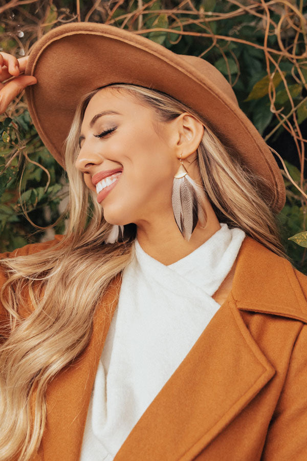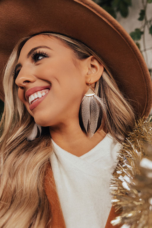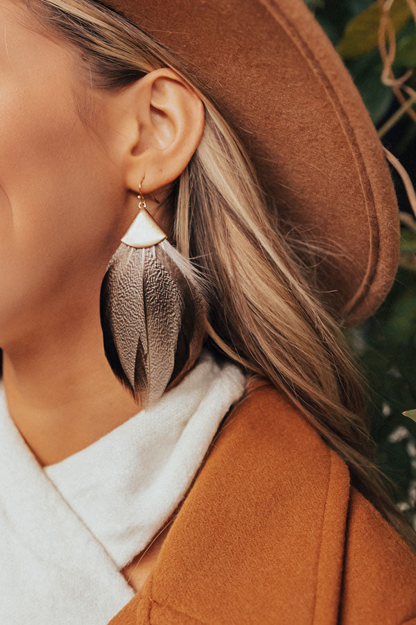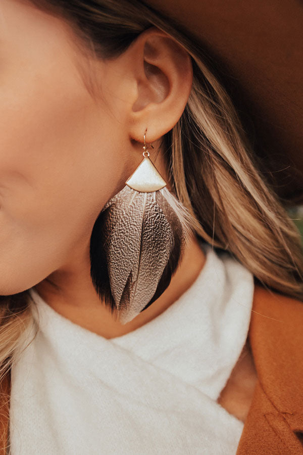 The beauty of these stunning statement earrings is timeless with their dangling gold triangles and oversized neutral hued feathers!