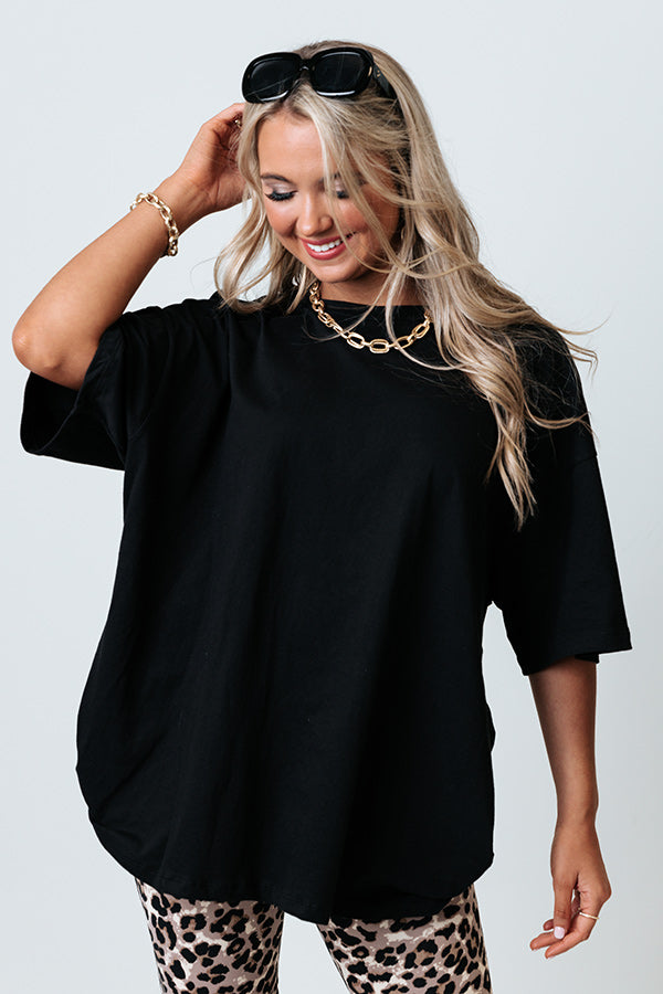 This is a timely reminder to add this casual black shift tee to your cart! It features soft and lightweight material, a rounded neckline, short loose sleeves, and an oversized and slouched silhouette that ends in a straight tunic-length hemline! Measurements