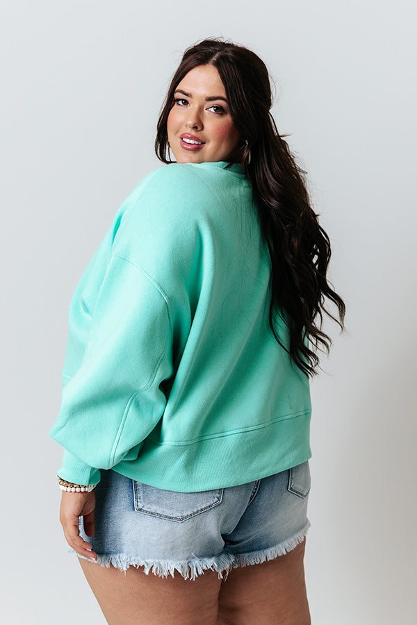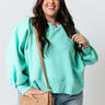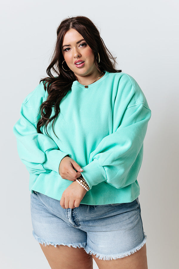 Plus Size - When headed 'to the mountains' there is no better piece to keep you warm than this adorable sea glass colored sweatshirt featuring soft lightweight material, a high rounded neckline, long bubble sleeves with fitted cuffs, and a relaxed silhouette that falls into a straight hemline! Measurements
