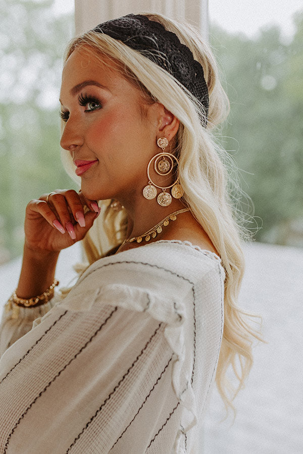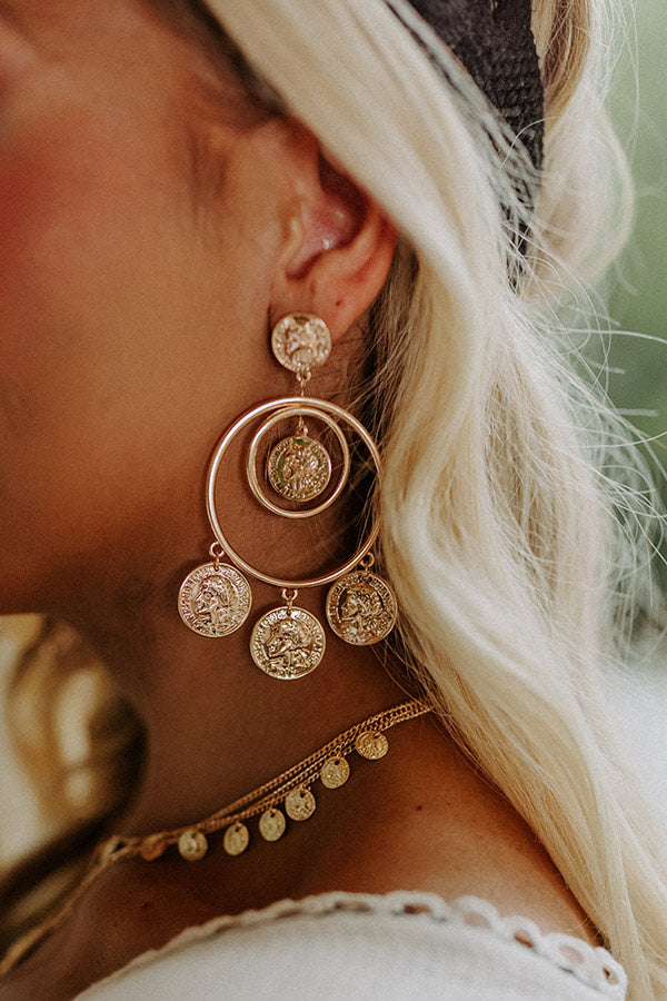 Add the perfect boho touch to any look with our adorable 'Toasting In Tuscany Earrings' featuring a gold coin stud and two thin dangling gold hoops with four gold coin charm accents!