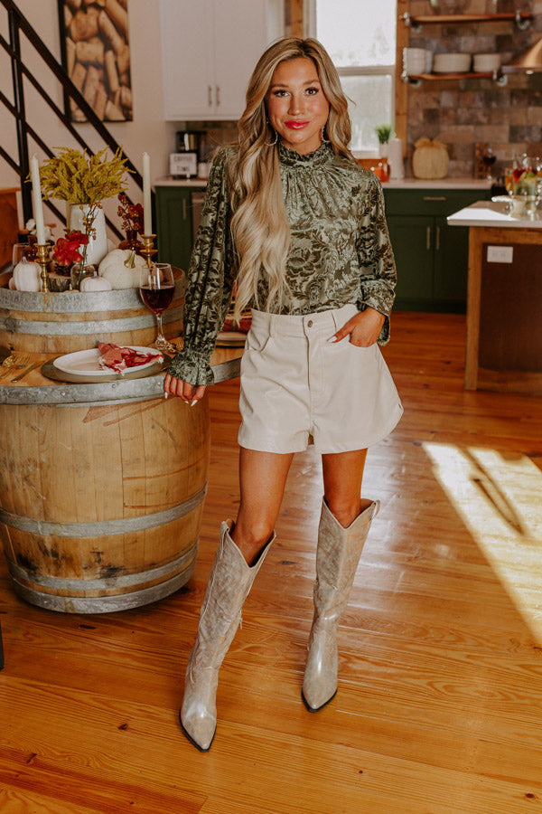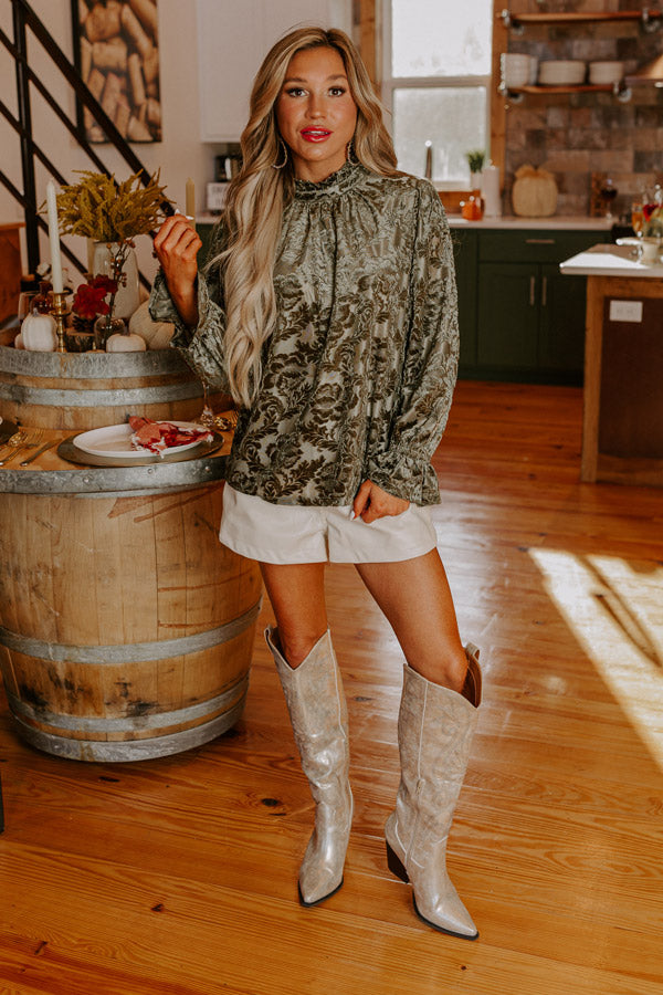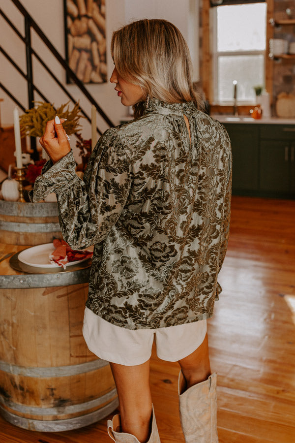 - A ruffled mock neckline with back button closure and a keyhole detail