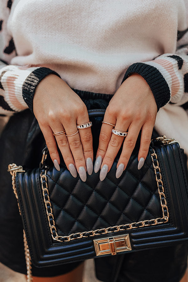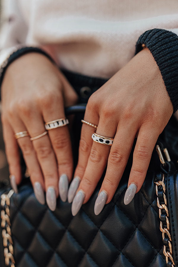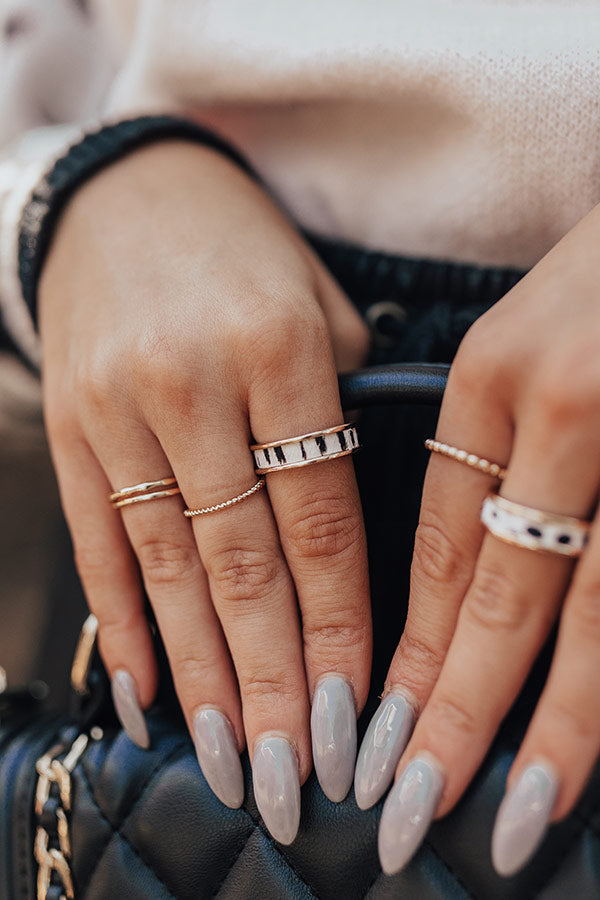 People are guaranteed to appreciate that you accessorized with this gorgeous ring set featuring six pieces ranging from thin stacking bands and wider black white spotted bands! This ring set can comfortable fit between sizes 5.5-8.