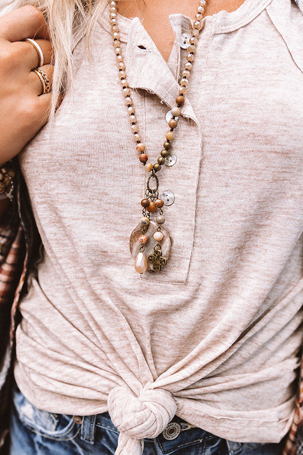 There is no such thing as looking too lovely, especially when you accessorize with this beautiful necklace featuring a long beaded chain and a large semi precious stone pendant!
