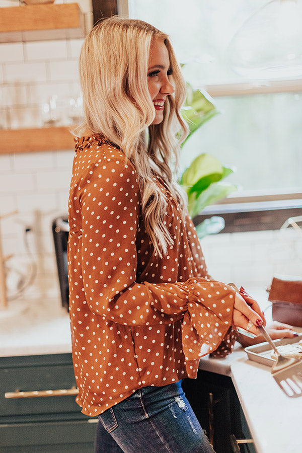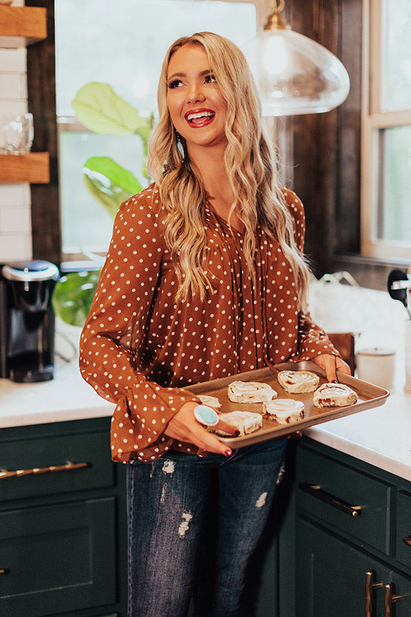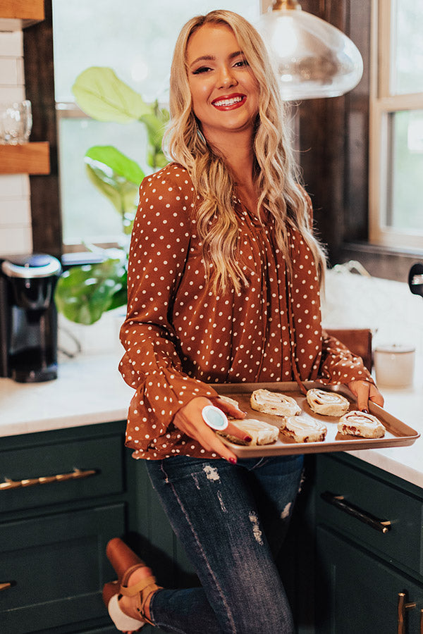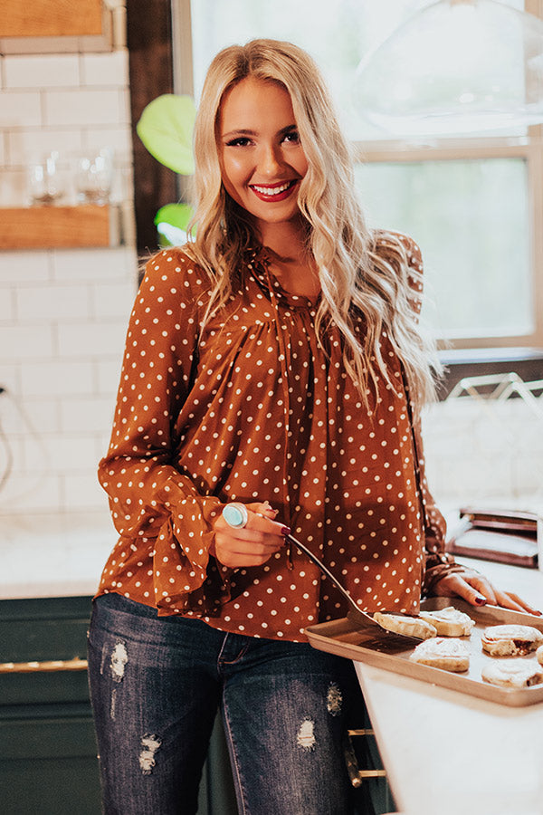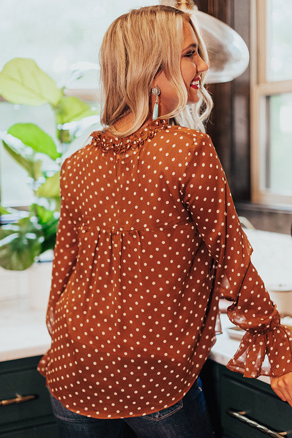 We have no doubt you will be at the top of your fashion class when you wear this darling chocolate colored shift top featuring lightweight flowy material patterned with a white polka dot print, long loose sleeves with flared cuffs, a v-cut neckline with a ruffled collar and a tie closure, and a relaxed silhouette that falls into a rounded hemline! Measurements