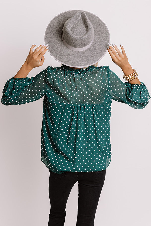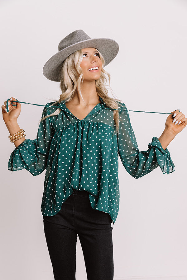 We have no doubt you will be at the top of your fashion class when you wear this darling lush meadow colored shift top featuring lightweight flowy material patterned with a white polka dot print, long loose sleeves with flared cuffs, a v-cut neckline with a ruffled collar and a tie closure, and a relaxed silhouette that falls into a rounded hemline! Measurements
