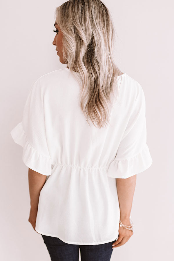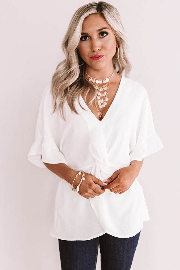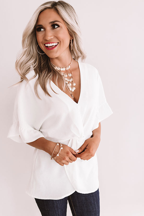 White is a pure color that everyone looks good in, so there is no doubt that you will look ravishing in this hot top! It has ruffled hems on the sleeves and the front is fitted into an oversized wrap! Pair with some cuffed skinny jeans, strappy neutral heels, a statement necklace, and a simple box clutch for a sexy and polished summer outfit! Measurements