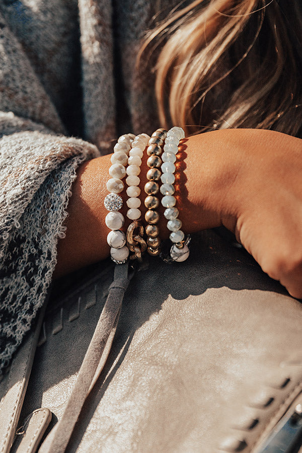 This stunning bracelet set is top tier with its four ivory, gold, shimmering, and semi precious beaded stretch pieces!