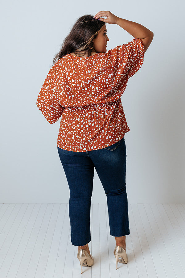 You are sure to turn heads in this flirty rust colored plus size top featuring lightweight material patterned with white and brown polka dots, a wrap bodice with a v-cut neckline, oversized half sleeves, a cinched waistline, and a flattering silhouette that falls into a straight peplum hemline!