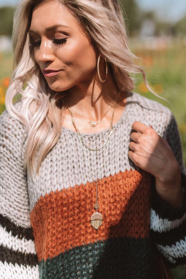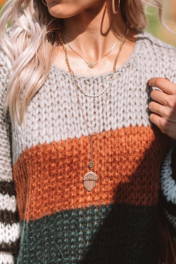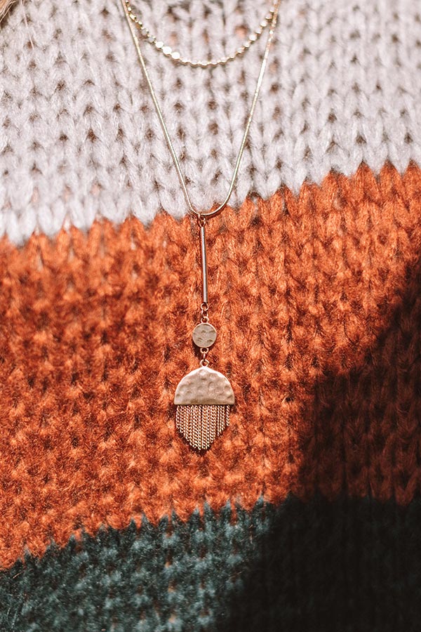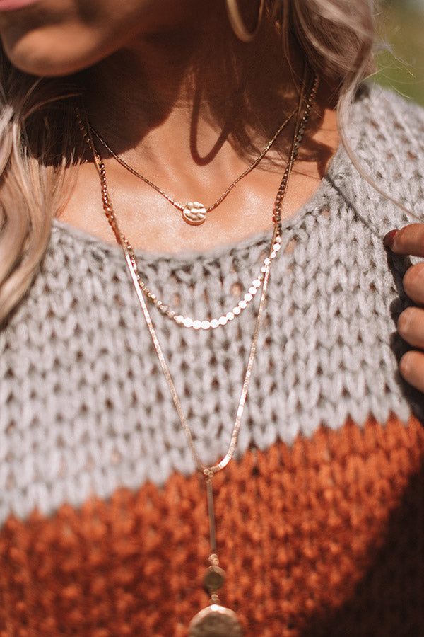 You will be a "total trendsetter" when you wear this statement necklace featuring three dainty chains adorned with a textured circles and a chain link tassel!
