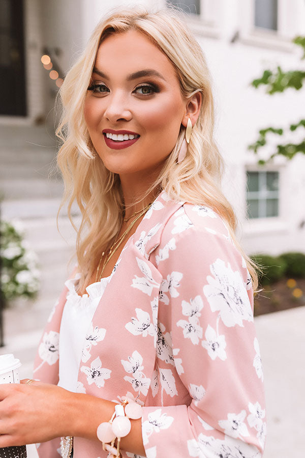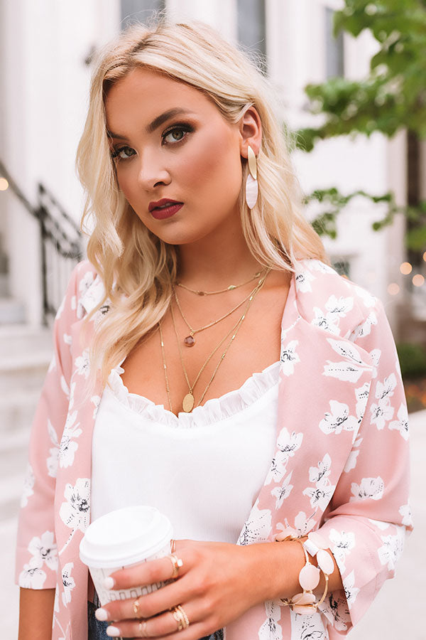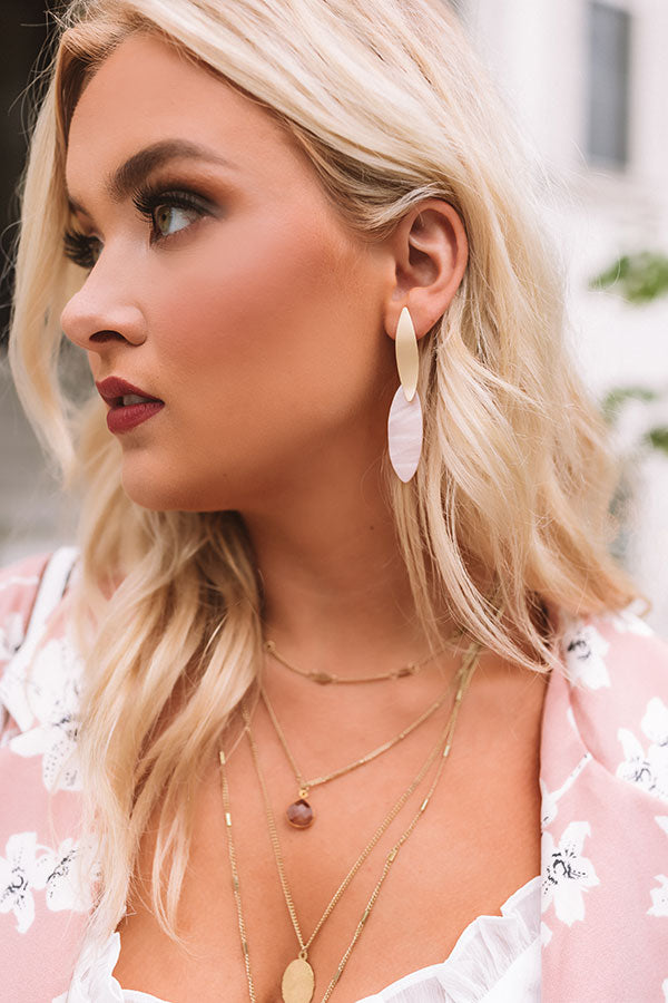 You are sure to steal the show when you accessorize with our "Tour Of Tahiti" statement earrings featuring a gold dangling pointed oval shape overlapping a larger blush colored one!