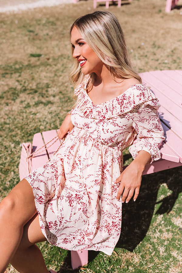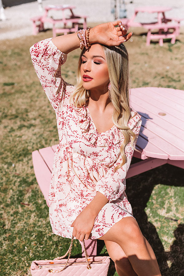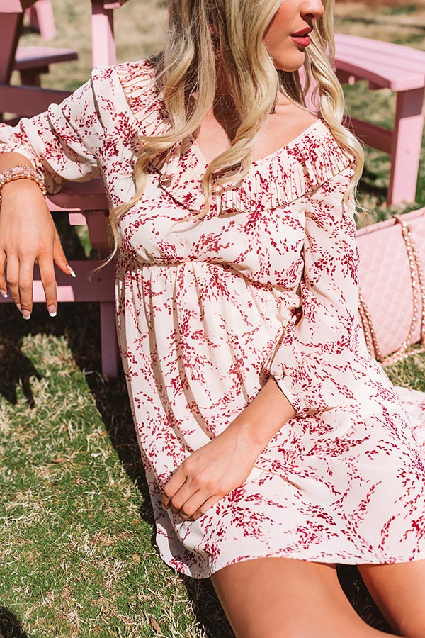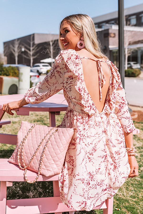 There is no better piece to wear while enjoying a "tour of Tribeca" than this champagne colored shift dress featuring lightweight breezy material patterned with a red floral print, ruffled trim detailing along the v-cut neckline and low open back with a tie closure, 3/4-length bubble half sleeves with fitted elastic banded cuffs, and a relaxed silhouette that falls into a straight mid-thigh length hemline! We have styled this cutie with some white heels and a blush clutch and statement earring, but you can also wear it with "The Sydney Wedge in Gold" and our "Pretty And Poised Rhinestone Hair Clip Set in Champagne!" Measurements