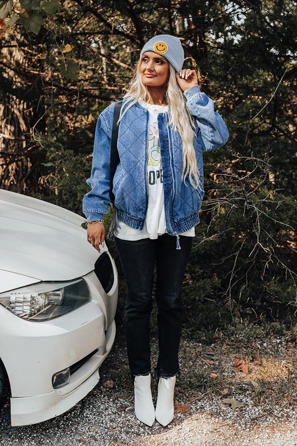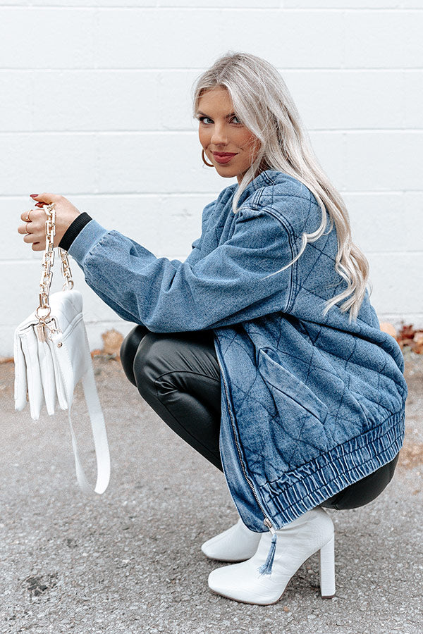 Channel all the vintage vibes with our trendy 'Tour The City' jacket featuring medium wash denim material with large diagonal quilted texturing, a zip closure front with a rounded neckline, long loose sleeves, two side pockets, and a slouched bomber silhouette that ends in a straight hemline!