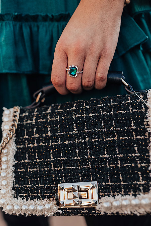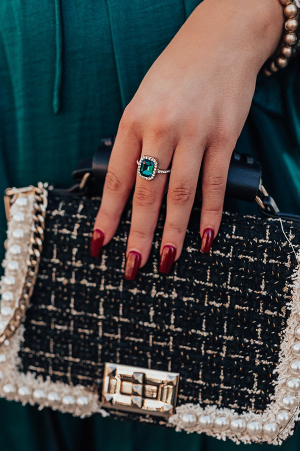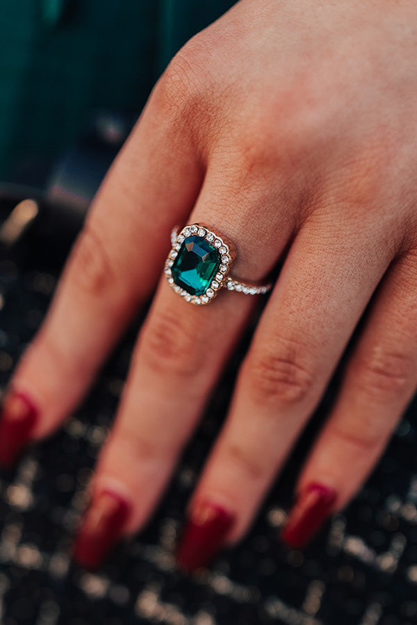 Make a bold statement with our stunning 'Tour The City Ring' featuring a thin rhinestone band with a large rectangular emerald stone surrounded by dainty shimmering rhinestones! This ring can comfortable fit a 6.5 size.