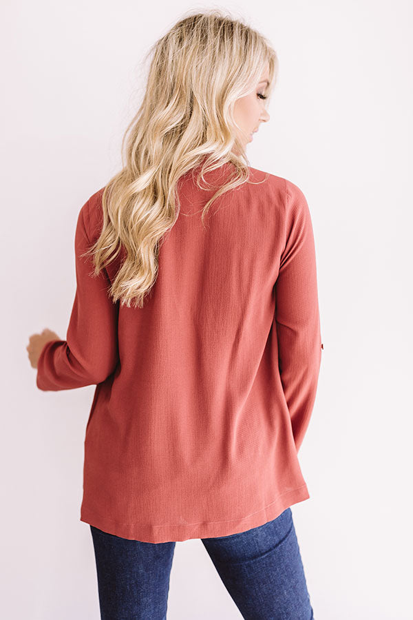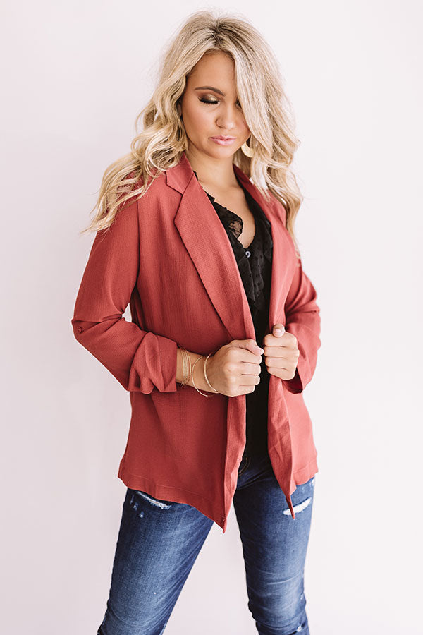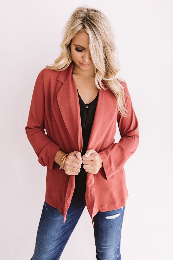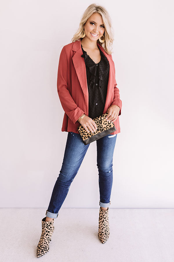 Add a little warmth to your workday or evening look with this casual aurora red blazer featuring a collared neckline with v-notched flaps, long fitted roll-tab sleeves, and a lightweight open-front polyester bodice that falls into a straight hemline! Wen "touring Rome" you can dress this piece up casually with a black tank, cuffed ankle skinnies, and a leopard bootie and clutch, or you can style it for work when you wear it with a chic white tee underneath, our "Office Goals High Waist Trousers in Iced Mocha" and "The Kara Heel in Iced Mocha!"