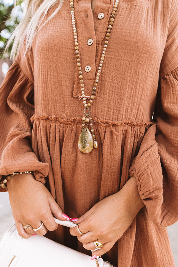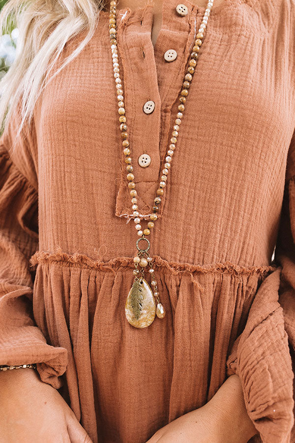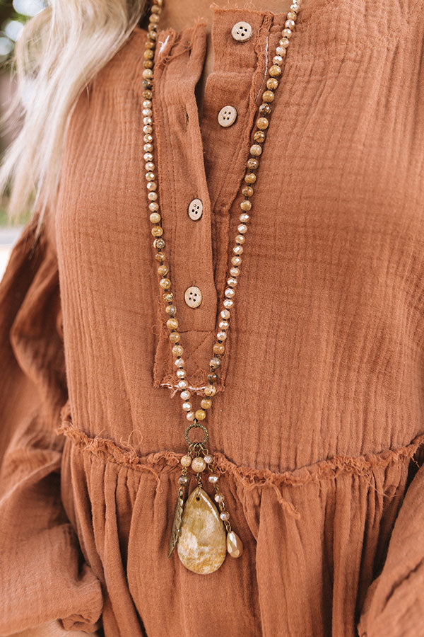 Take your look to the next level with our gorgeous 'Trade Off' statement necklace featuring a long natural beaded chain with an earthy semi precious teardrop stone pendant!