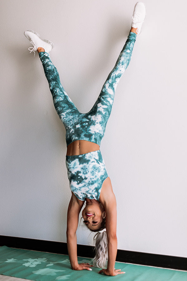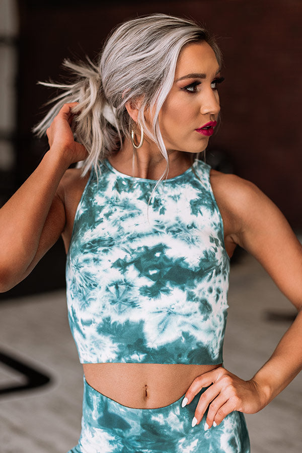 Be a style trail blazer with this trendy crop top featuring smooth lightweight material patterned with bold teal colored tie dye, a high rounded neckline, 1-inch sleeveless shoulder straps, and a flattering figure hugging silhouette that ends in a straight cropped hemline!