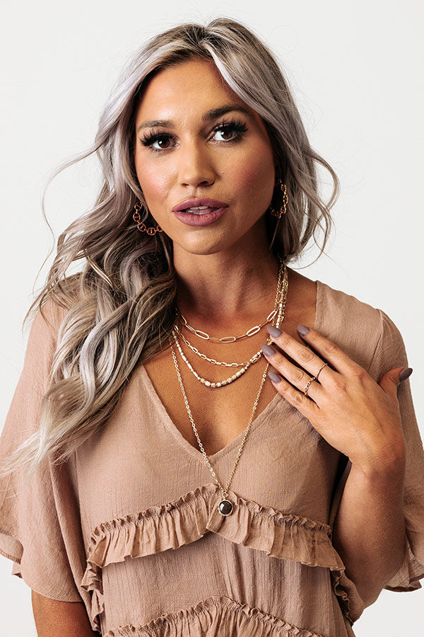 We believe in surrounding yourself with pretty things...like beautiful jewelry! Our pretty gold 'Trail Less Traveled' necklace features four layered pieces: an elongated chain link choker, a daintier medium length chain, another ivory beaded medium length chain, and a longer chain with a small circle stone pendant!