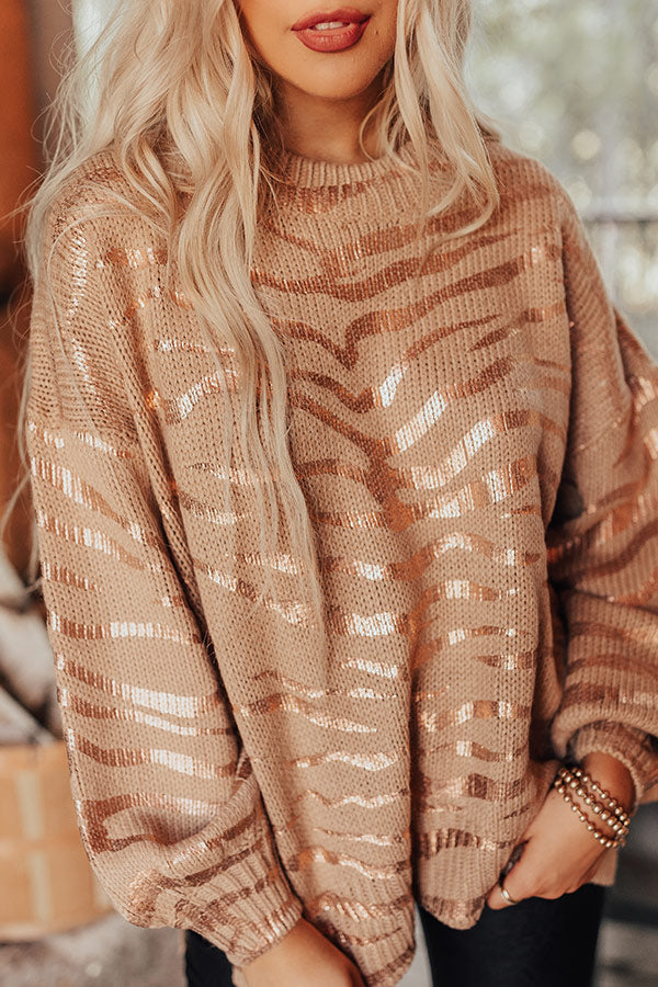 Take a walk on the wild side in our gorgeous iced latte colored 'Trailside Talks' sweater featuring soft knit material patterned with a metallic gold zebra print, a rounded neckline, long loose sleeves with fitted cuffs, and a slouched silhouette that falls into a straight hemline with accent side slits! Measurements