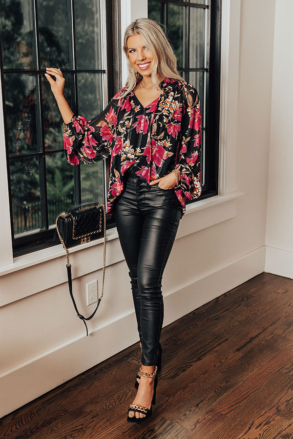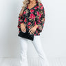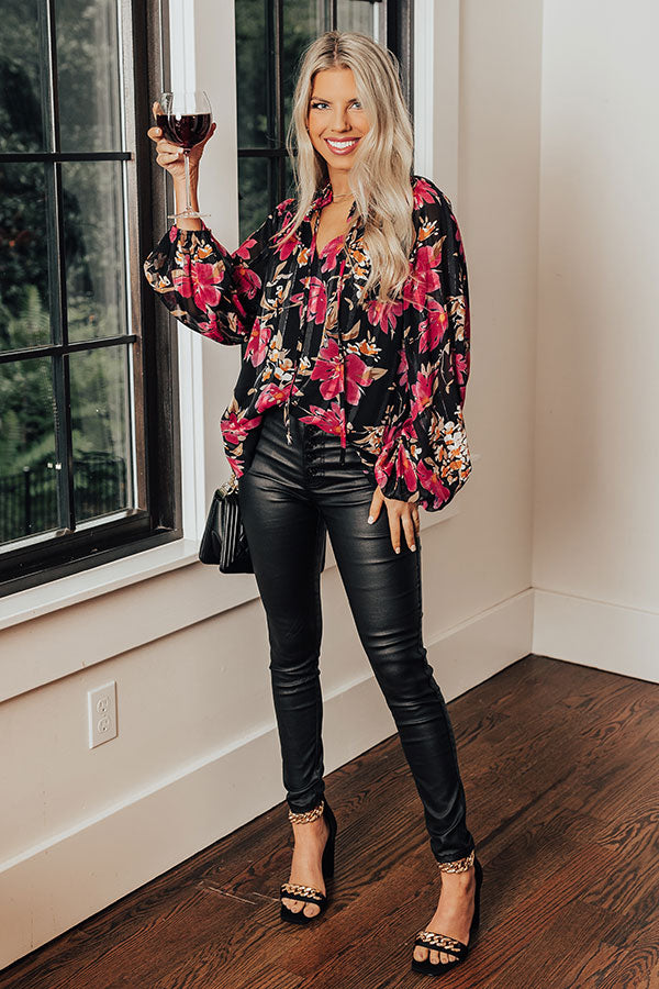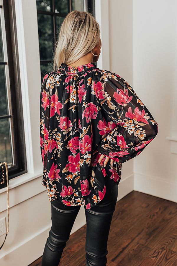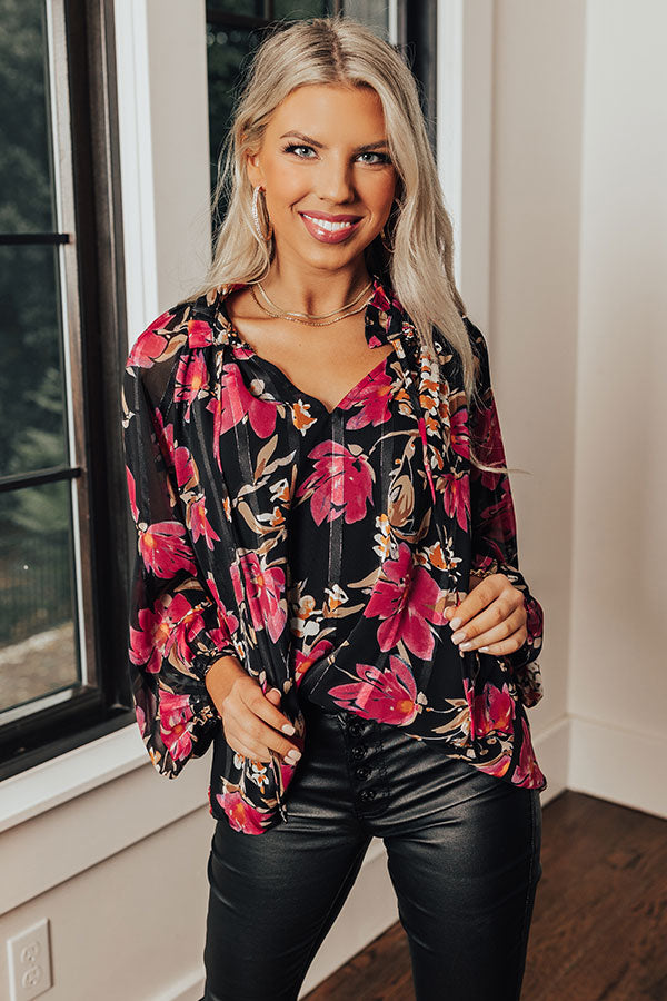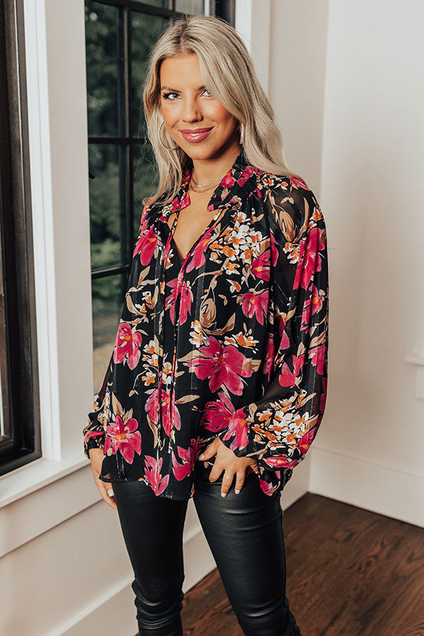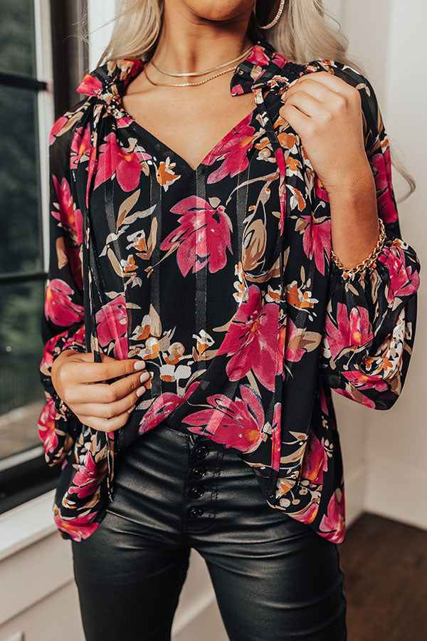 Be bold in our pretty black 'Train To Paris' shift top featuring lightweight flowy material patterned with a vibrant fuchsia hued floral print, a tie closure v-cut neckline with a ruffled collar, long oversized sleeves, and a relaxed silhouette that falls into a rounded hemline!
