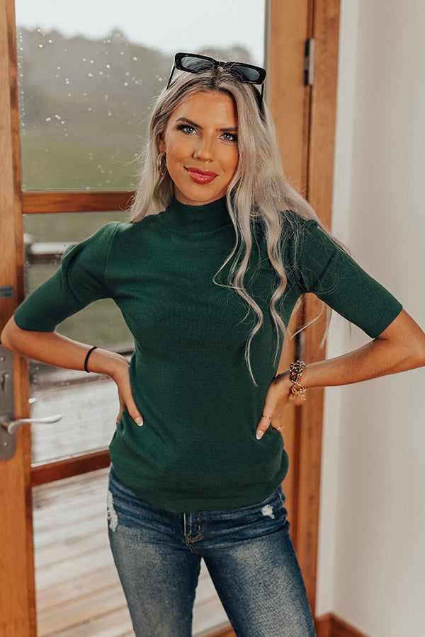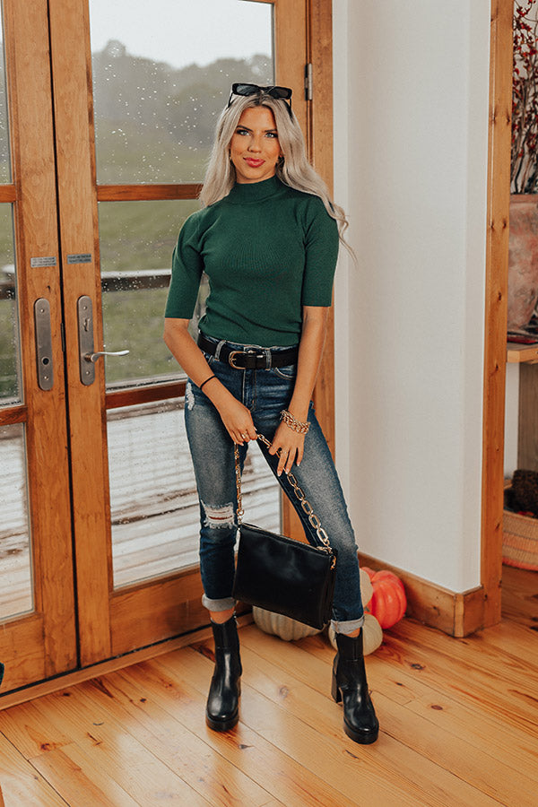 Keep your fall wardrobe simple but stylish in our basic hunter green 'Travel Around The World Top' featuring lightweight four-way stretch material, a high neckline, fitted half sleeves, and a flattering figure hugging silhouette that ends in a straight hemlien!