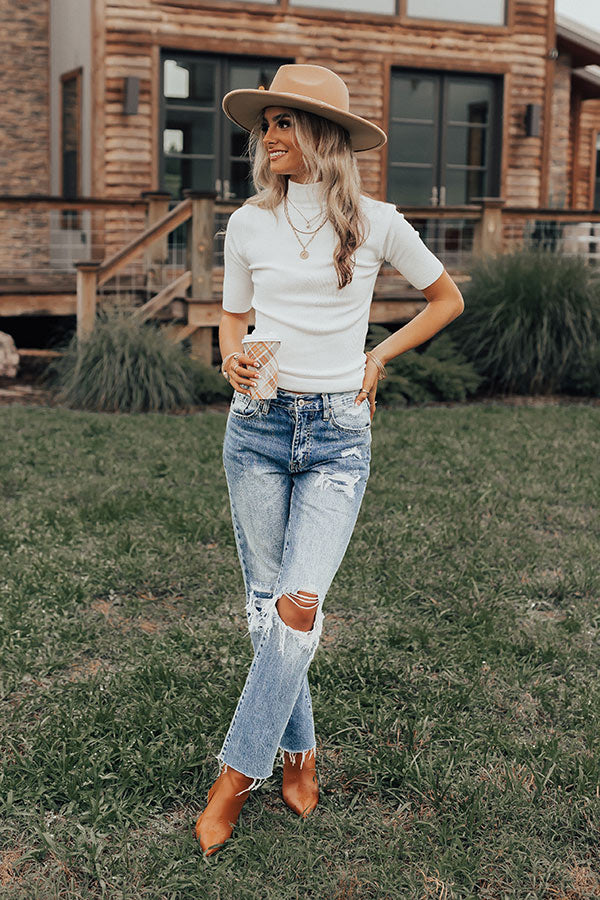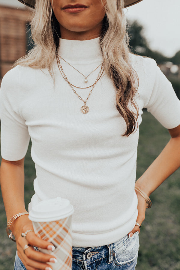 Keep your fall wardrobe simple but stylish in our basic white 'Travel Around The World Top' featuring lightweight four-way stretch material, a high neckline, fitted half sleeves, and a flattering figure hugging silhouette that ends in a straight hemlien!