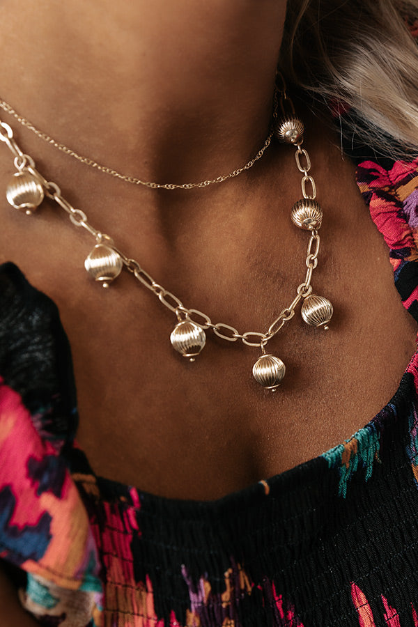 Travel in style with this gorgeous gold necklace featuring two layered pieces, a dainty choker and a longer large link chain with ribbed ball charms!