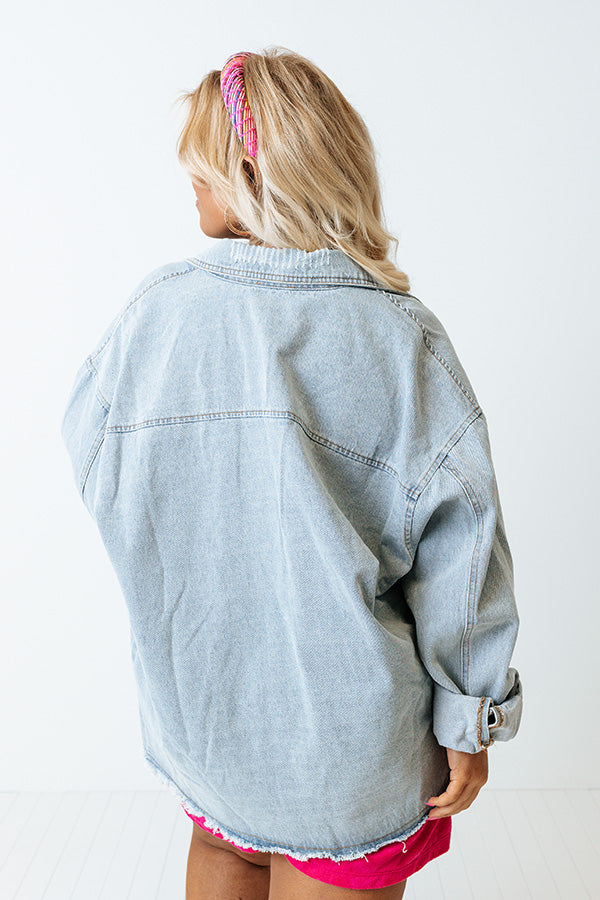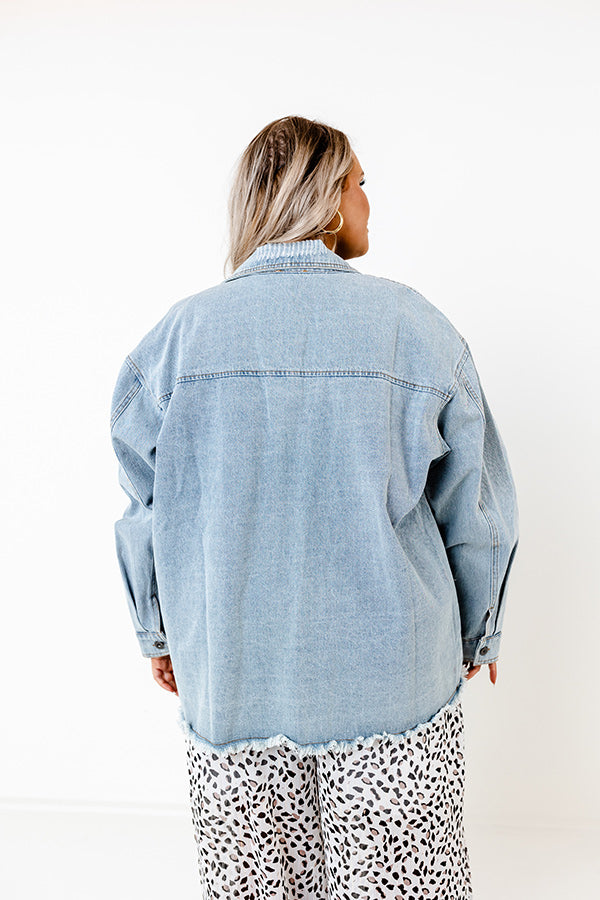 There is no better piece to wear on summer adventures than our adorable plus size 'Travel Life' jacket featuring lightweight light wash denim material, a button down front with a collared neckline, long loose sleeves with button closure cuffs, two chest pockets with flap closures, and a relaxed silhouette that ends in a straight frayed hemline! on products