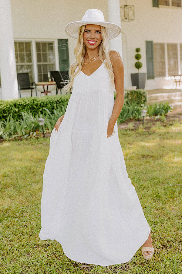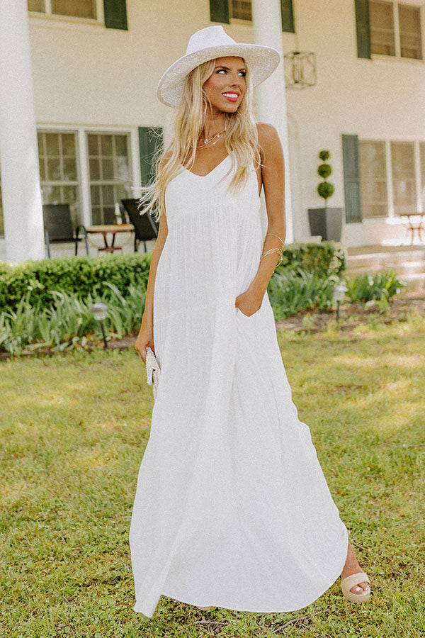 There is no better piece to pack when you travel this summer than this casual cute white maxi dress featuring lightweight breezy material, a v-cut neckline, spaghetti straps that cross and tie in the back, hidden side pockets, and a draped silhouette that cascades into a straight ankle-length hemline!