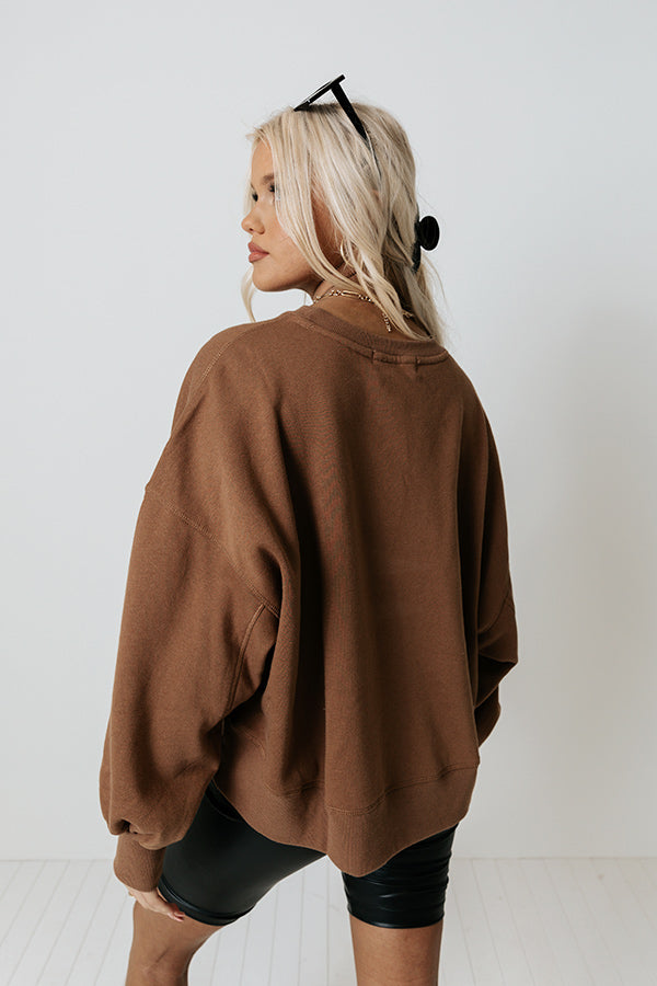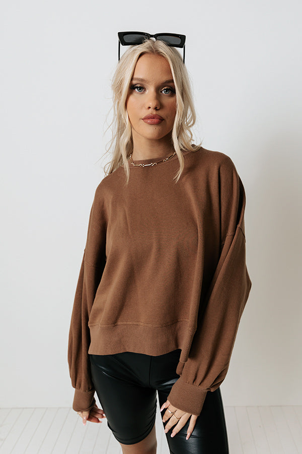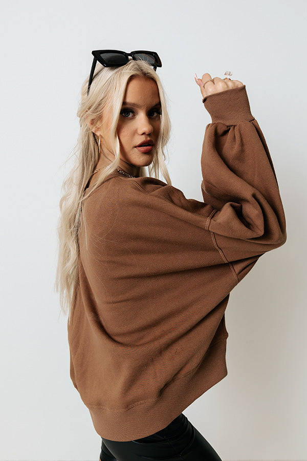 If you travel often, then we have the perfect piece for you! This casual but cute brown sweatshirt features soft lightweight material, a rounded neckline, long loose sleeves with fitted cuffs, and a slouched silhouette that ends in a straight hemline!