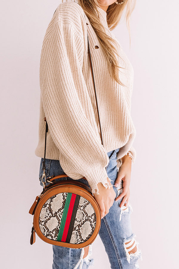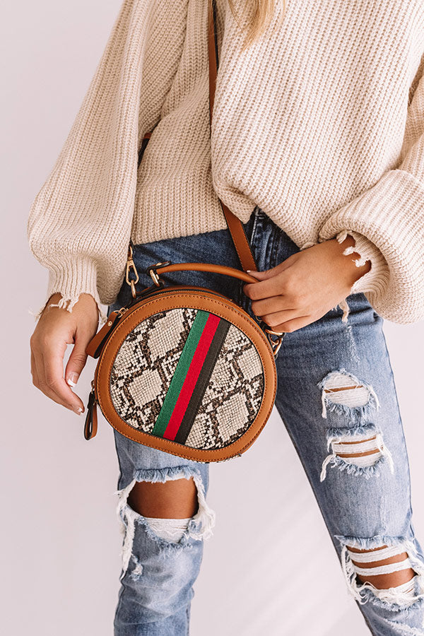 There is no better accessory to "travel the world" with than this brown faux leather crossbody featuring a rounded shape with a snake print pattern and texture, a green, red, and black accent stripe, one short handle, a spacious fully lined zip closure pouch with additional inside pockets, and an adjustable and removable shoulder strap!