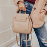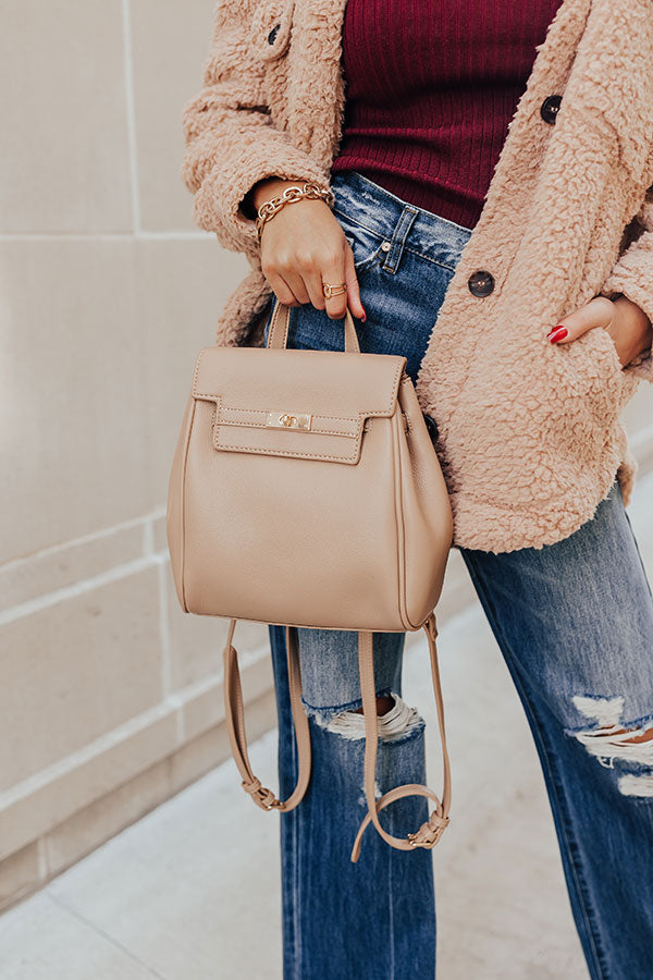 You won't find a more versatile everyday bag than our chic iced latte colored 'Travel Together' backpack featuring lightweight faux leather material, a short handle and two adjustable shoulder straps, a flap closure with a twist clasp, and a a spacious fully lined pouch!