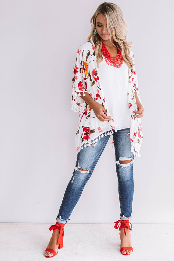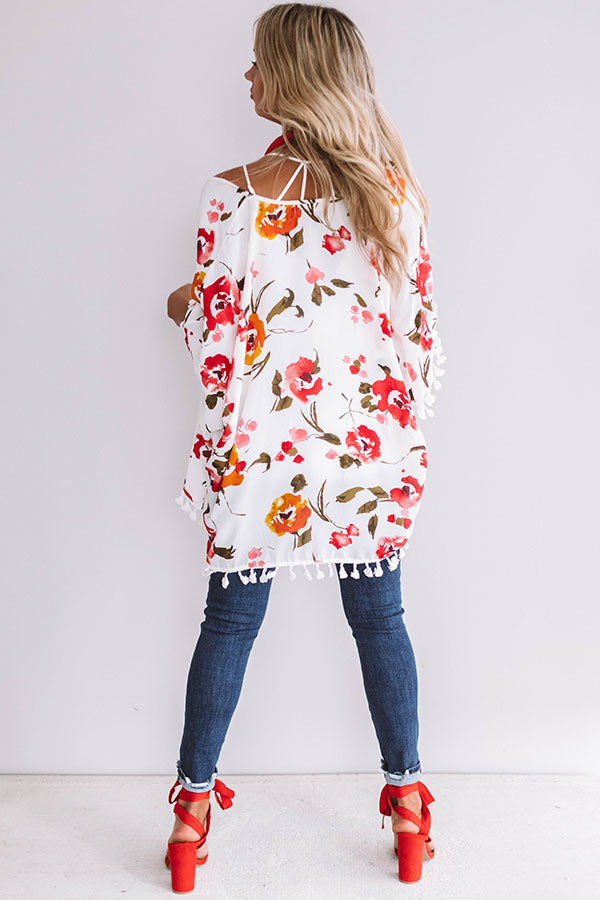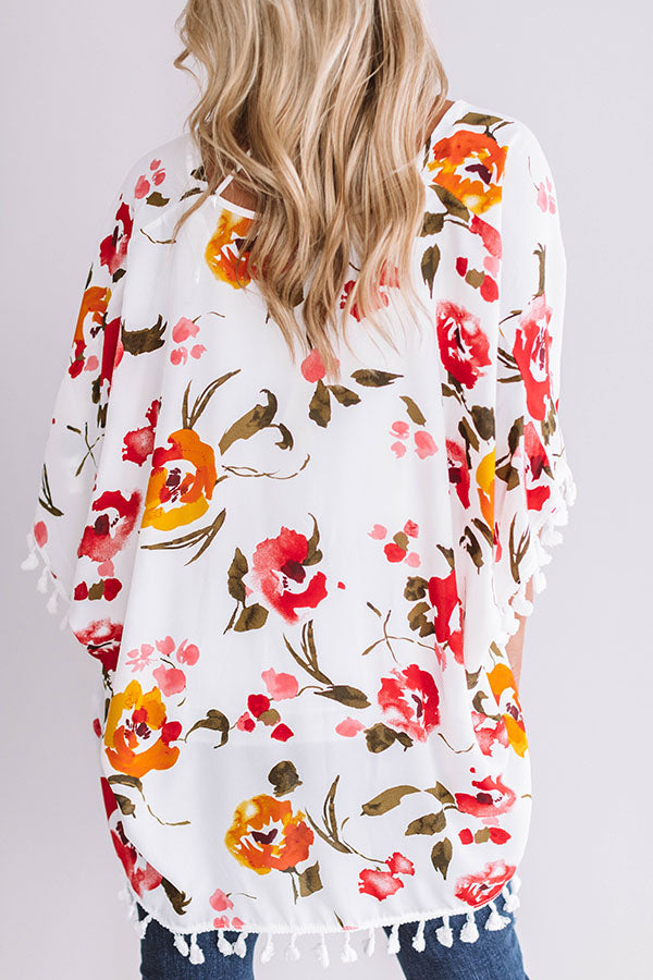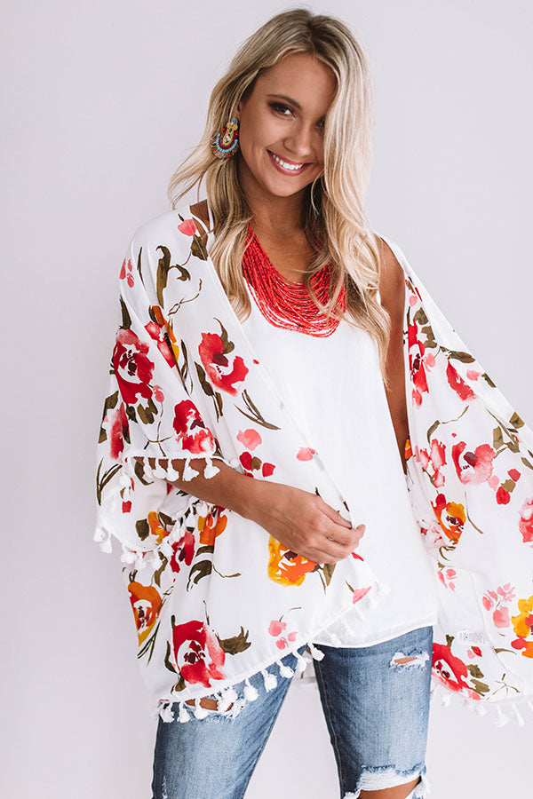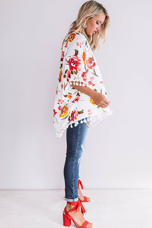 Get paradise and patio party ready with the "Traveling To Paradise Floral Overlay!" This fabulous piece has short kaftan sleeves with tasseled trim and a relaxed open front poly bodice with a tasseled bottom hem! Style over any of your favorite basics to instantly spring your look to life!