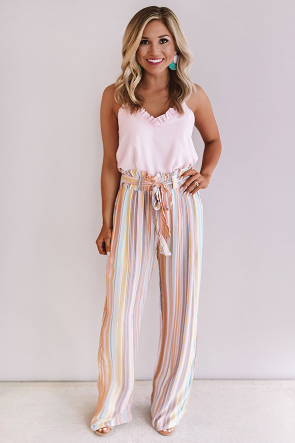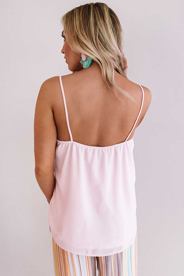 This pink shift tank is for all you island girls with its spaghetti straps, ruffled v-neck, and flowy bodice! Style this upscale basic with white striped trousers, colored statement earrings, and wedges! Measurements