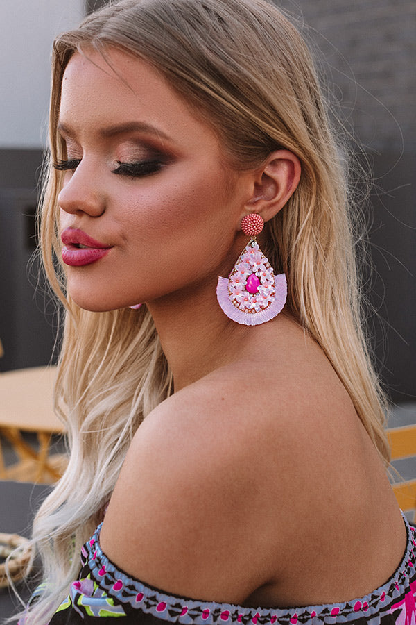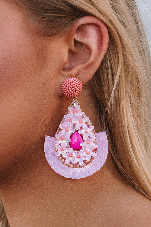 These adorable pink statement earrings are surely a "treasure" with their beaded half ball studs and dangling sequin flower teardrops with accent tassel fans!