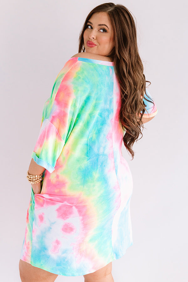 Plus Size - Keep up with the current trends in this colorful dress featuring soft lightweight breezy material patterned with pink, blue/green, and yellow tie dye, a high rounded neckline, short loose sleeves, accent side pockets, and a relaxed silhouette that falls into a rounded mid-thigh length hemline! You can style this cutie a variety of ways, like with some neutral wedges, but you can also wear it with "The Mara Sandal in Pink," matching sunnies, and our "Costa Kisses Woven Tote!" Measurements