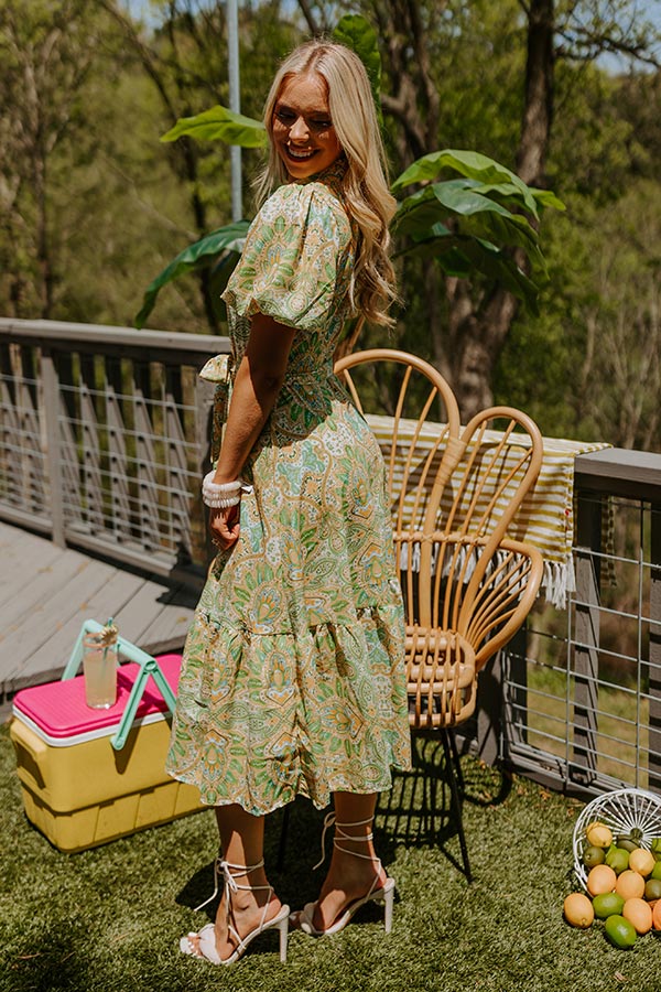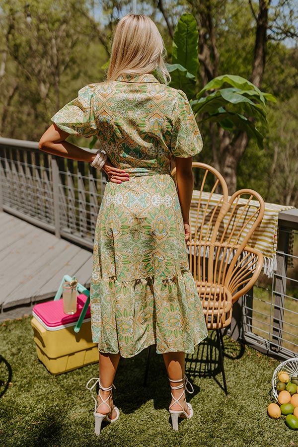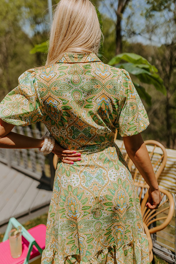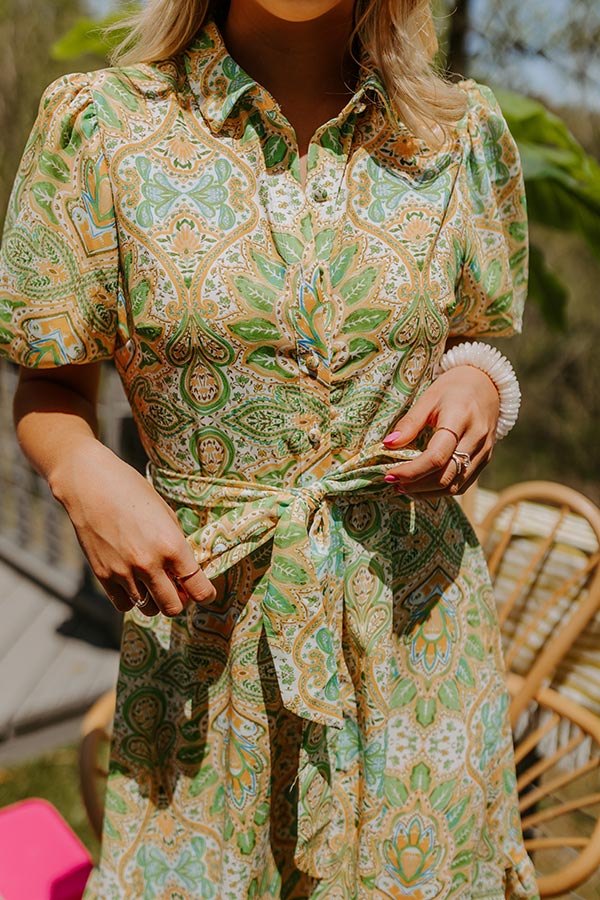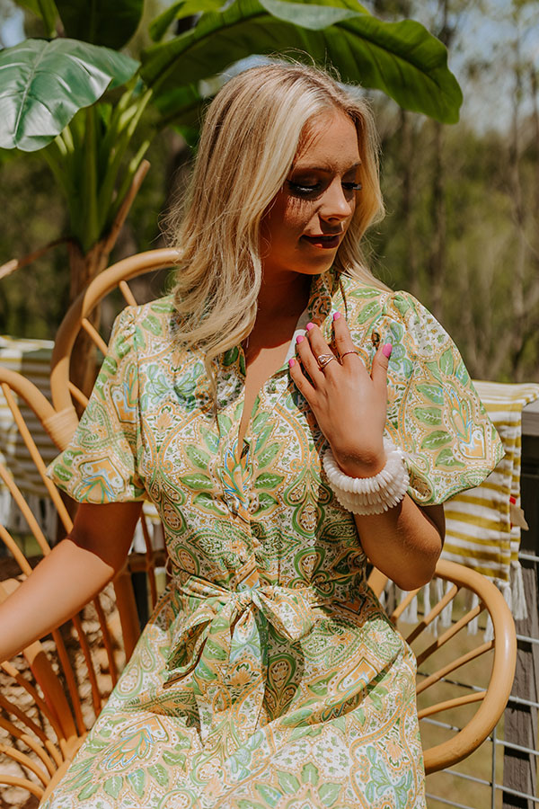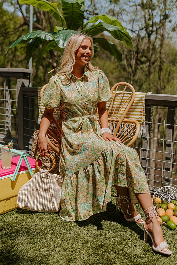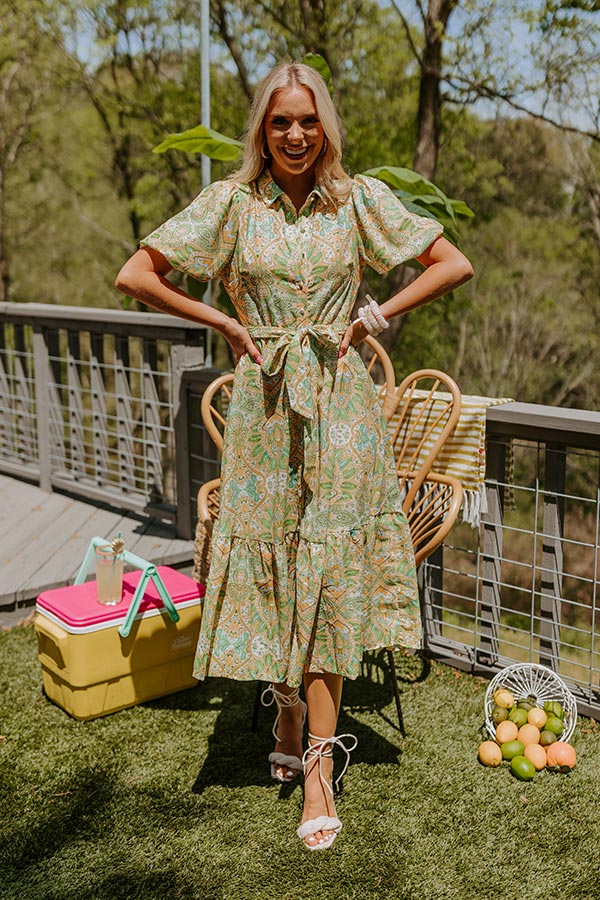 You will be a total trend maker this summer when you wear this gorgeous midi dress featuring lightweight material patterned with a beautifully intricate blue, green, and peach hued floral print, a button down front with a collared neckline, short puff sleeves, a ribbon belt waistline, and a relaxed but flattering silhouette that falls into a straight mid-calf length peplum hemline! on products